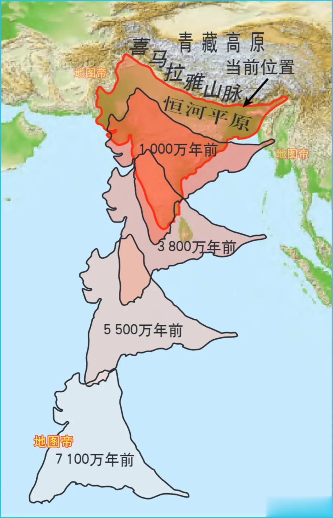 2.4亿年前,印度板块经过长途跋涉,海底部分撞上北边的欧亚板块,剧烈挤压,并不断向欧亚板块下插入,地表不断抬升。2.1亿年前,喀喇昆仑山、唐古拉山、横断山脉露出海面。8000万年前,冈底斯山、念青唐古拉山露出海面。6500万年前,喜马拉雅山脉露出海面,并持续上升,逐渐形成如今的青藏高原。