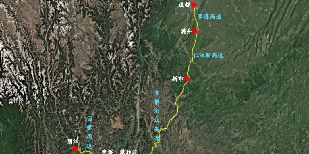 四川有个高速规划,其中有一条从成都到丽江的线路,从整体上可看做沪蓉高速的联络线,这条线路从成都出发,走仁寿,过井研,经犍为,穿屏山,然后走钻天岭隧道到雷波,再沿金沙江左岸,走金阳,布拖,会东,会理到攀枝花,从攀枝花到川滇交界的荣将镇,然后走古茶马古道到云南丽江。