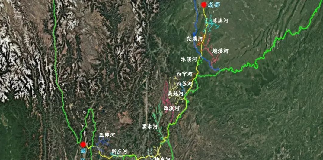 在翻越龙泉山后,其经过了球溪河流域的上游段,再在井研境内经过了茫溪河流域和越溪河流域,随后跨过岷江,再走过沐川的沐溪河,在新市镇附件跨过西宁河,在雷波的马颈子处跨过金沙江左岸一级支流西苏河,在米西洛附件跨过美姑河,又在梗堡乡处跨过西溪河,然后再白鹤滩对岸的大营山处跨过宁南的黑水河,在会东跨过糁鱼河,在会理跨过渔泡江上游,然后跨金沙江到攀枝花,再在川滇交界处跨从荣将镇而来的新庄河,然后沿五郎河后,再跨金沙江,翻山到丽江。