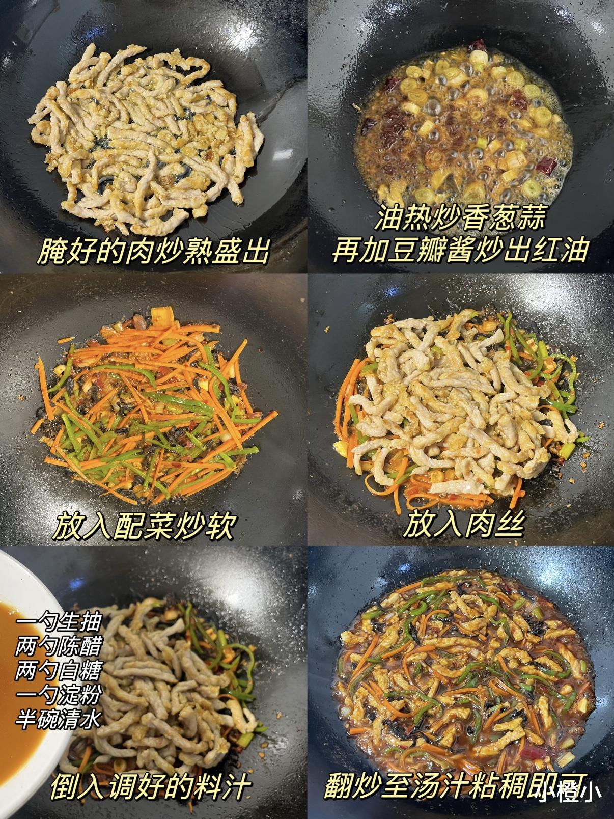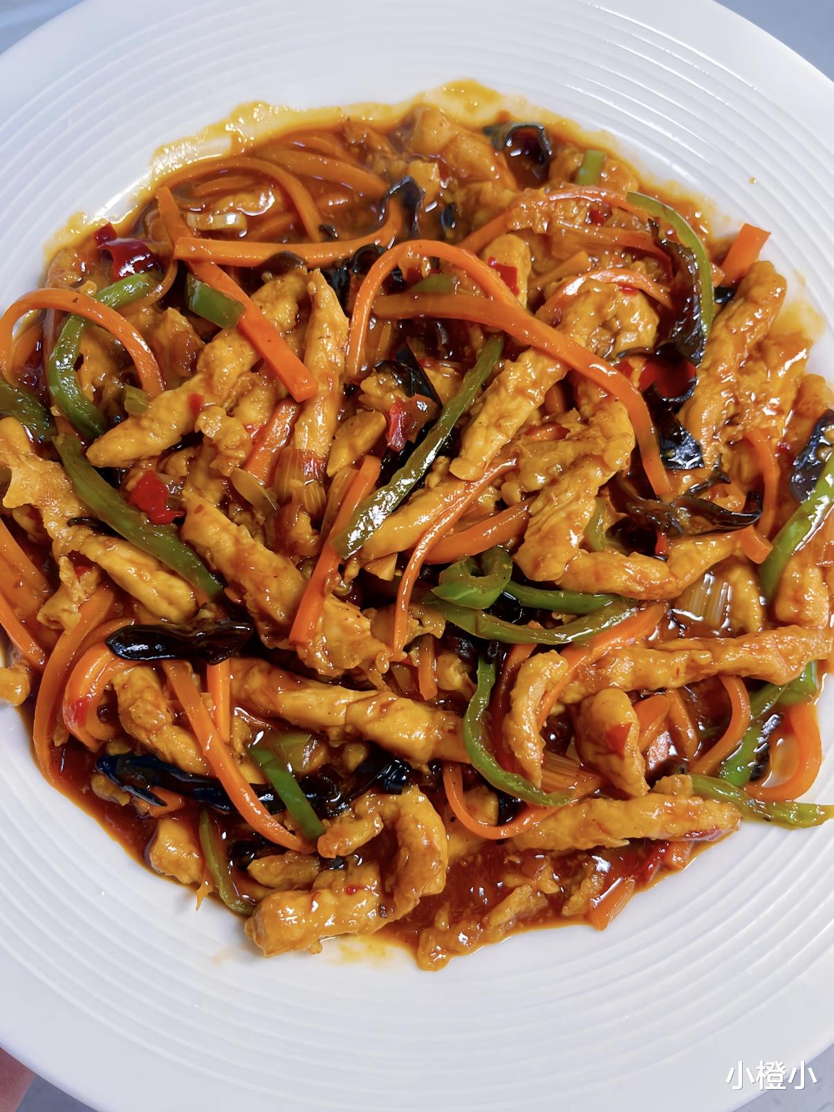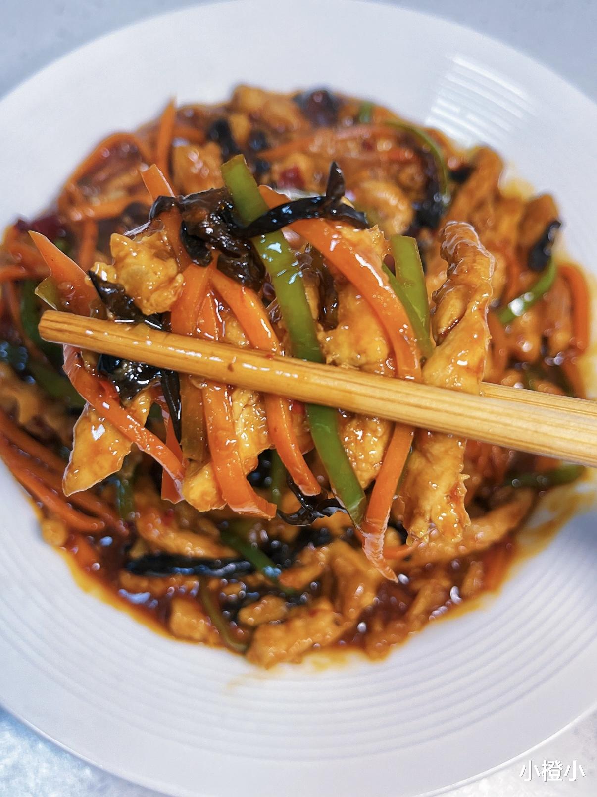 Step3 配菜全倒进,转中火 30 秒炒软,把肉丝回锅,料汁搅匀淋入。锅边听到“滋啦”就是淀粉在勾芡,翻 5 下汤汁变稠,关火!从倒汁到出锅不超过 20 秒,动作慢就成“煮菜”。