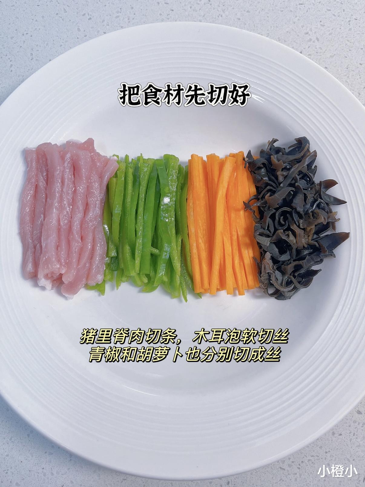 3. 配菜就手边:青笋、胡萝卜、木耳、青椒……颜色越多越“骗”小朋友吃菜,统统切细丝,长度跟肉丝差不多,夹菜不“跑碗”。