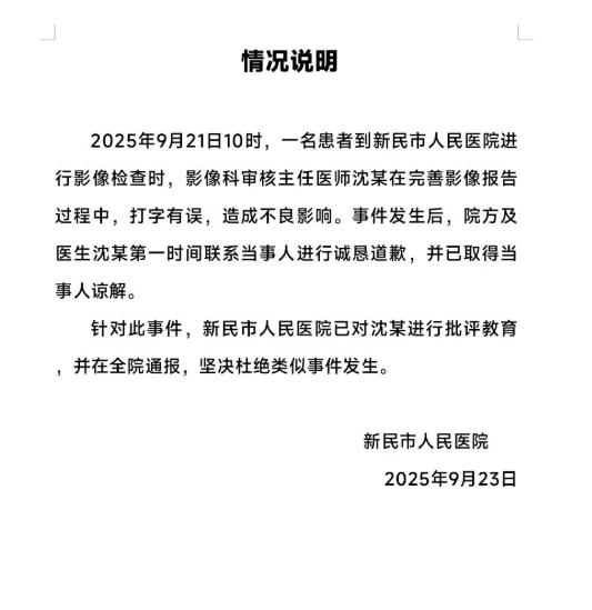 2025年9月21日10时,一名患者到新民市人民医院进行影像检查时,影像科审核主任医师沈某在完善影像报告过程中,打字有误,造成不良影响。事件发生后,院方及医生沈某第一时间联系当事人进行诚恳道歉,并已取得当事人谅解。