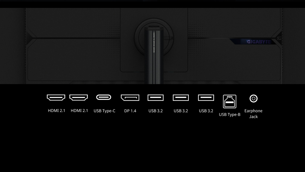 背部预留的接口比较丰富,2组HDMI 2.1接口、1个DP 1.4接口、1个3.5毫米耳机接口、3组USB接口、1个Type B接口、1个Type C接口和一个UAB-A接口,满足日常视频/音频信号和数据传输完全够用。