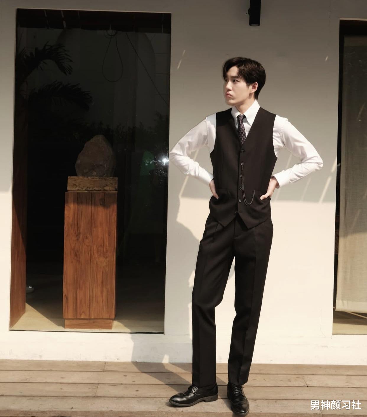 日常看最常见的穿搭就是用西装裤搭配马甲和衬衫,三件套能把你比较温文尔雅的公子哥的那一面给展现出来。但是这个look也有一个很致命的缺点,穿不好就像是卖保险的。裤腿不能太长,看上去更加利落一些。