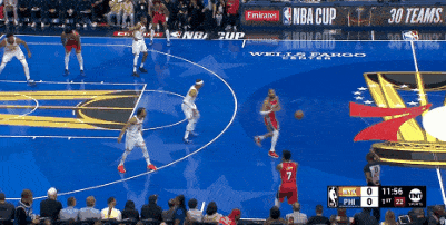 和19猛龙一样让中锋(小加、恩比德)发牌。他们和上面提到的“23-24赛季快船案例”打的变种一样,把发牌者的位置安排在了另一个肘区,给无球侧二打二提供了更开阔的空间。