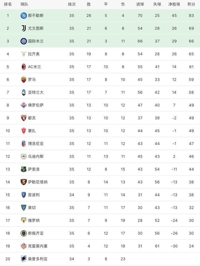 昨晚今晨,意甲联赛第35轮激战多场,罗马客场0-0战平博洛尼亚,遭到联赛5轮不胜,继续排名第6位,争夺联赛前4的希望已经微乎其微;尤文图斯主场2-0击败克雷莫内塞,稳居联赛第2位,法乔利和布雷默分别破门;那不勒斯客场0-2输给蒙扎,吃到联赛第4场败仗。