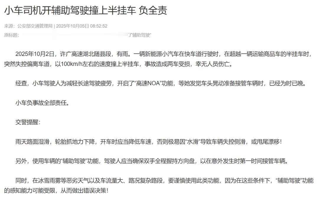 “雨天开车 = 降速” 的想法可太片面了,前几天国庆假期的时候许广高速的事故就是教训:一辆新能源车开着高速 NOA 功能,雨天以 100km/h 速度超车时突然失控撞向半挂车,幸好没人受伤。