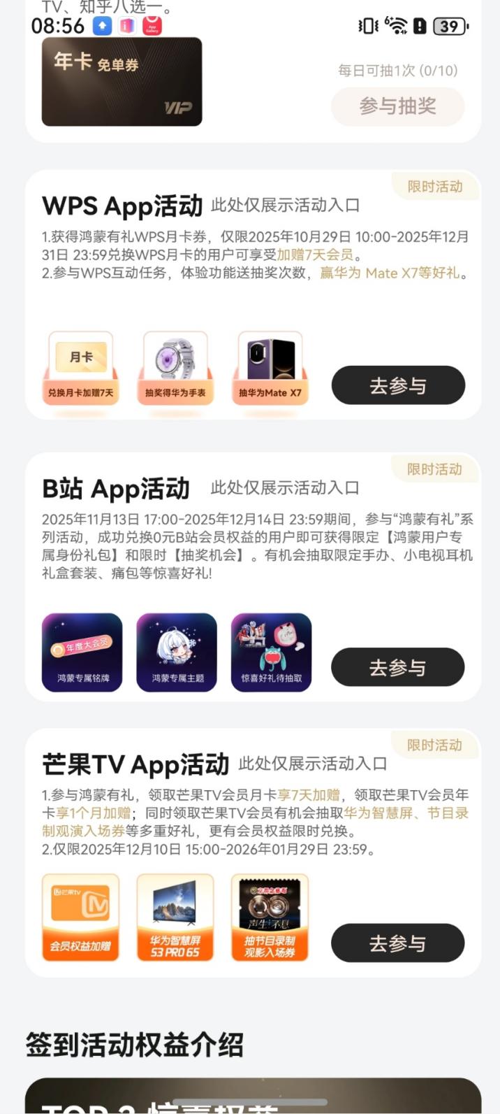 现在鸿蒙有礼还有WPS、芒果TV以及小红书等礼上加礼活动,兑换的时候不仅加赠会员权益时长,还有机会获得超级多的福利。比如WPS的活动就是兑换鸿蒙有礼WPS月卡券可享加赠7天会员,要是参与WPS互动任务体验特色功能活动,还有机会抽华为Mate X7和华为手表。