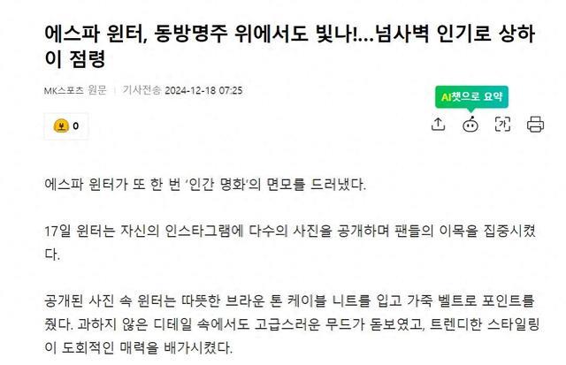 据韩国媒体12月18日报道,aespa成员Winter在个人Instagram上公开了一组“都市大片”级别的美照,瞬间点燃了粉丝圈。照片中,Winter身穿温暖的棕色系编织毛衣,搭配皮质腰带,简洁中透着高级感,轻松演绎出时尚达人范儿。