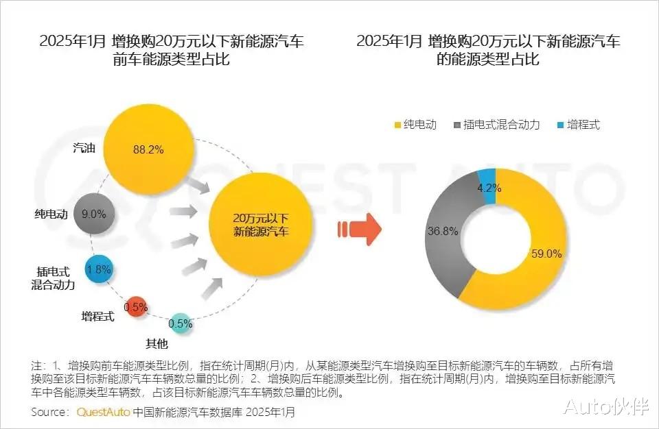 根据最新报告显示,2025年新能源汽车的增换购市场持续升温,“油换电”已成为主流趋势。截至今年1月的数据,增换购新能源汽车的用户中,有超过87%的前车为汽油车。在20万元以下价格区间的新能源汽车市场中,纯电动车占据主导地位,占比达59%。