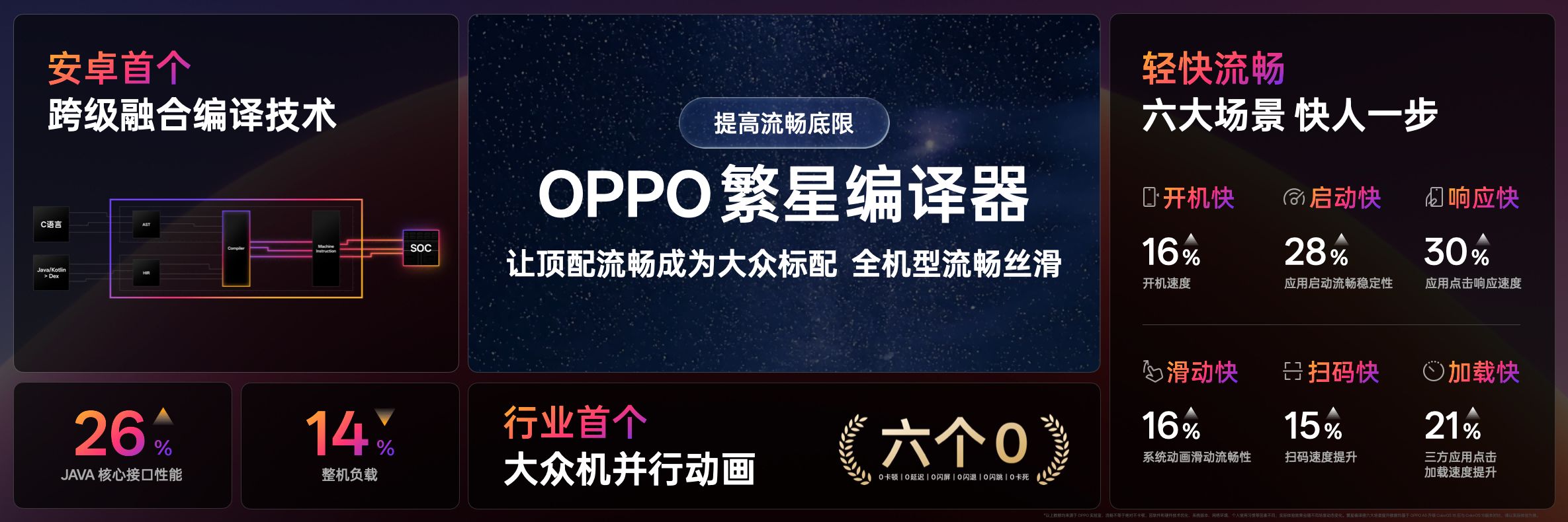 更关键的是,繁星编译器打通了上层和底层的编译能力,让ColorOS 16具备了最前沿的编译能力,真正的实现了跨级融合编译的技术突破,让底层和上层代码能够进行统一编译优化。在繁星编译器的优化下,安卓Java核心接口性能提升了26%,整体负载降低14%。更重要的是,繁星编译器驱动编译算法效率提升,让没有顶配处理器的大众机,也能有“0卡顿、0延迟、0闪屏、0闪退、0闪跳、0卡死”的“六个0”流畅体验,让机圈德芙,既是顶配,也是标配。