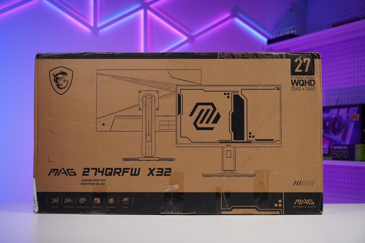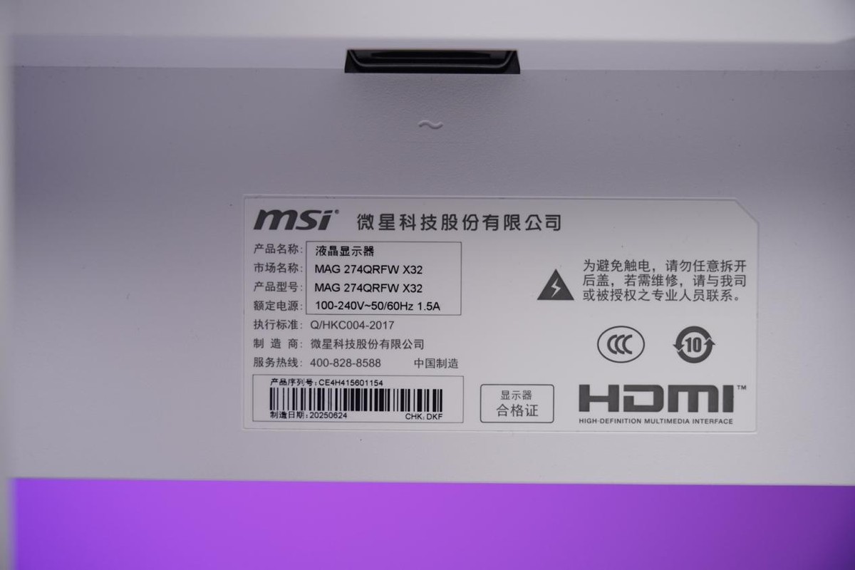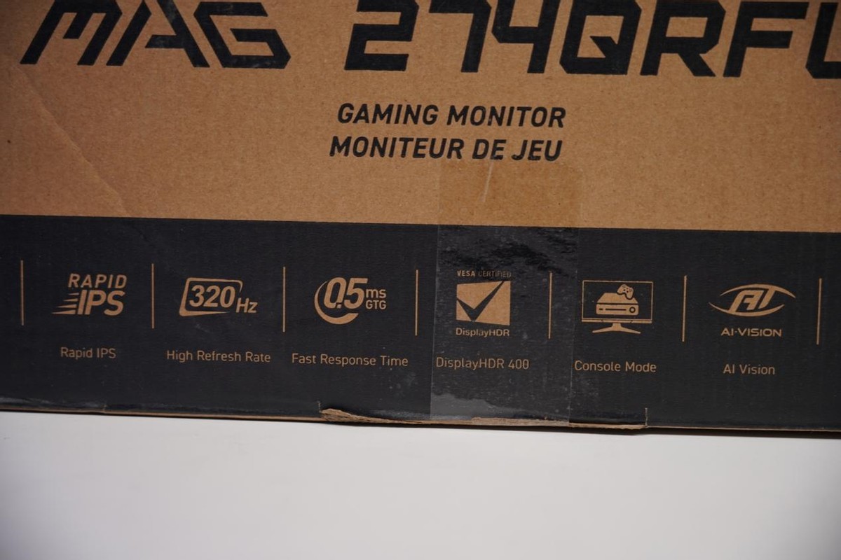 MAG 274QRFW X32作为一款千元级别的显示器,日常价格是1500左右,要是活动加上国补的话是直接来到1100-1200元的幅度,并且从外包装盒上很清晰的看到这款显示器所有的特色标识:2560x1440分辨率,快速液晶(WQHD) IPS 面板、320Hz 刷新率以及快速 0.5 毫秒(GtG,最小)响应时间,以上这些特色很明显就是主流高刷显示器的标配了。
