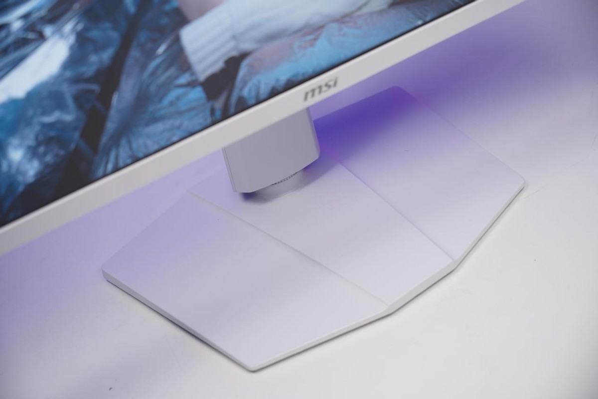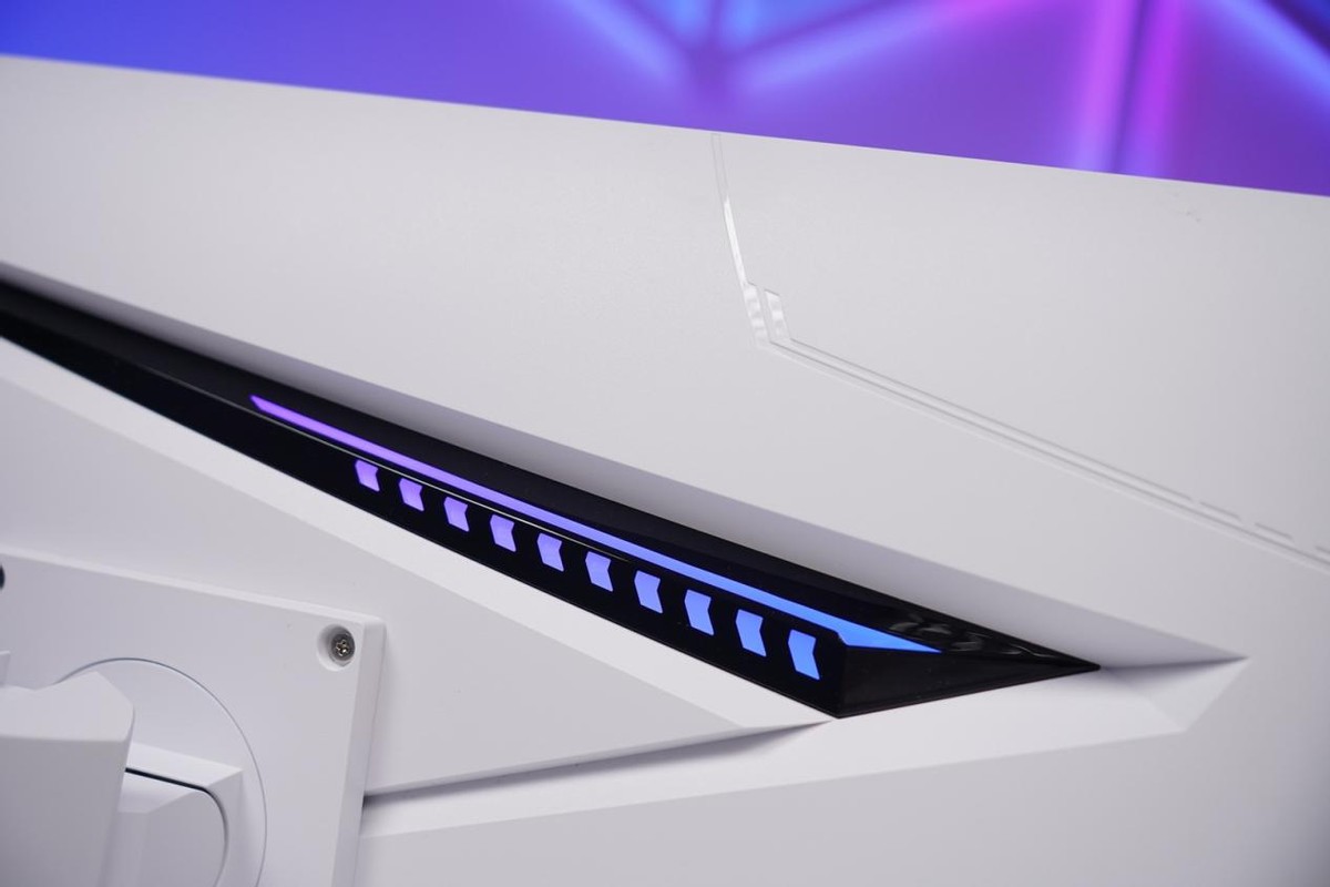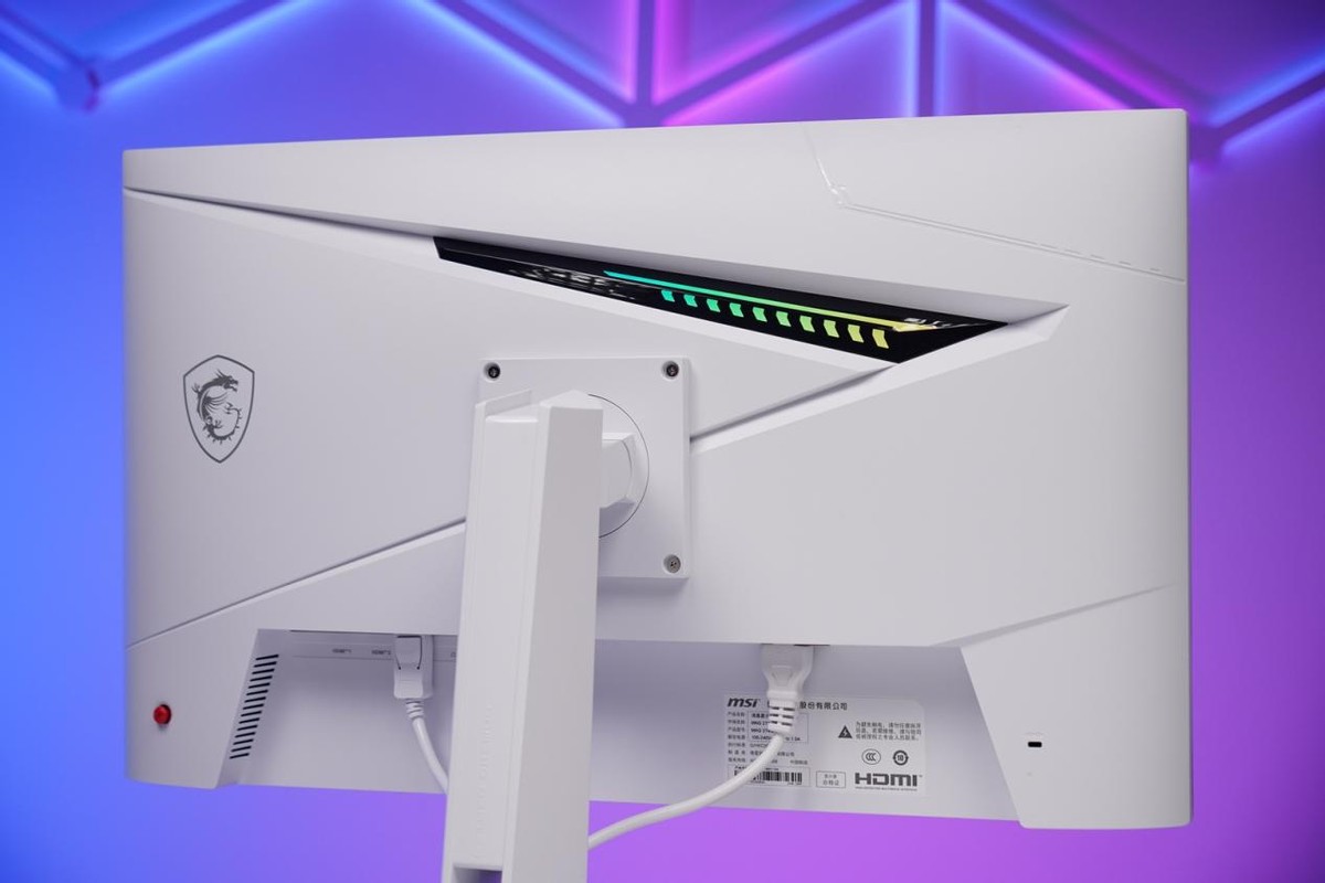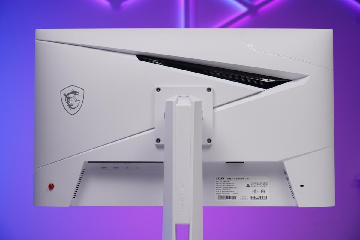 背部白色机甲风的和微星其他款显示器都很接近,不规则几何方块拼接+电竞氛围灯。