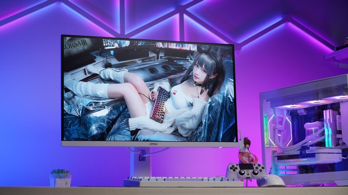 实际屏摄表现(正面,左右两侧,竖屏均无出现漏光或者阴阳屏的状况),再把和主机放置在一起桌面搭建就完成了,不知道大家对于MAG 274QRFW X32的色彩表现如何?