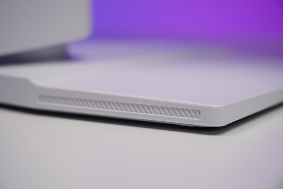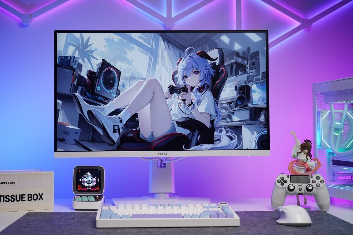 因为主机搭配的是白色,所以显示器也是入手的白色版本。本体采用了纯白窄边框的27英寸的Rapid IPS 面板,据官方介绍屏幕采用雾面防眩光处理,可以大幅度减弱环境光线的反射,即使在光线较为复杂的使用环境下,也能清晰地看到屏幕内容,避免了因反光而造成的视觉干扰。