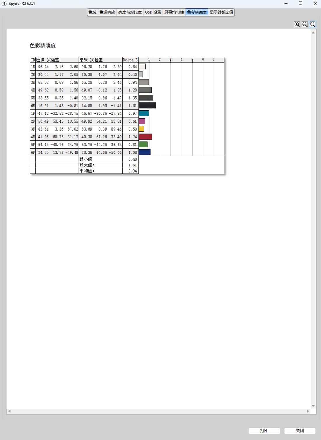 取平均△E值为0.94,其中最大差异为1.61,最小为0.40。所以对比各项的色彩精准度后对这款显示器的表现是否达到了专业水准了?