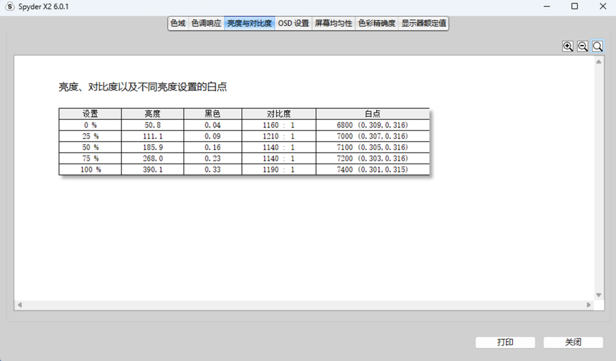 亮度与对比度:1000:1的对比度显示可提供的影像动态范围更高,在色温一致性方面,这款显示器的白点色温在0~100亮度下6800~7400的表现测试结果。