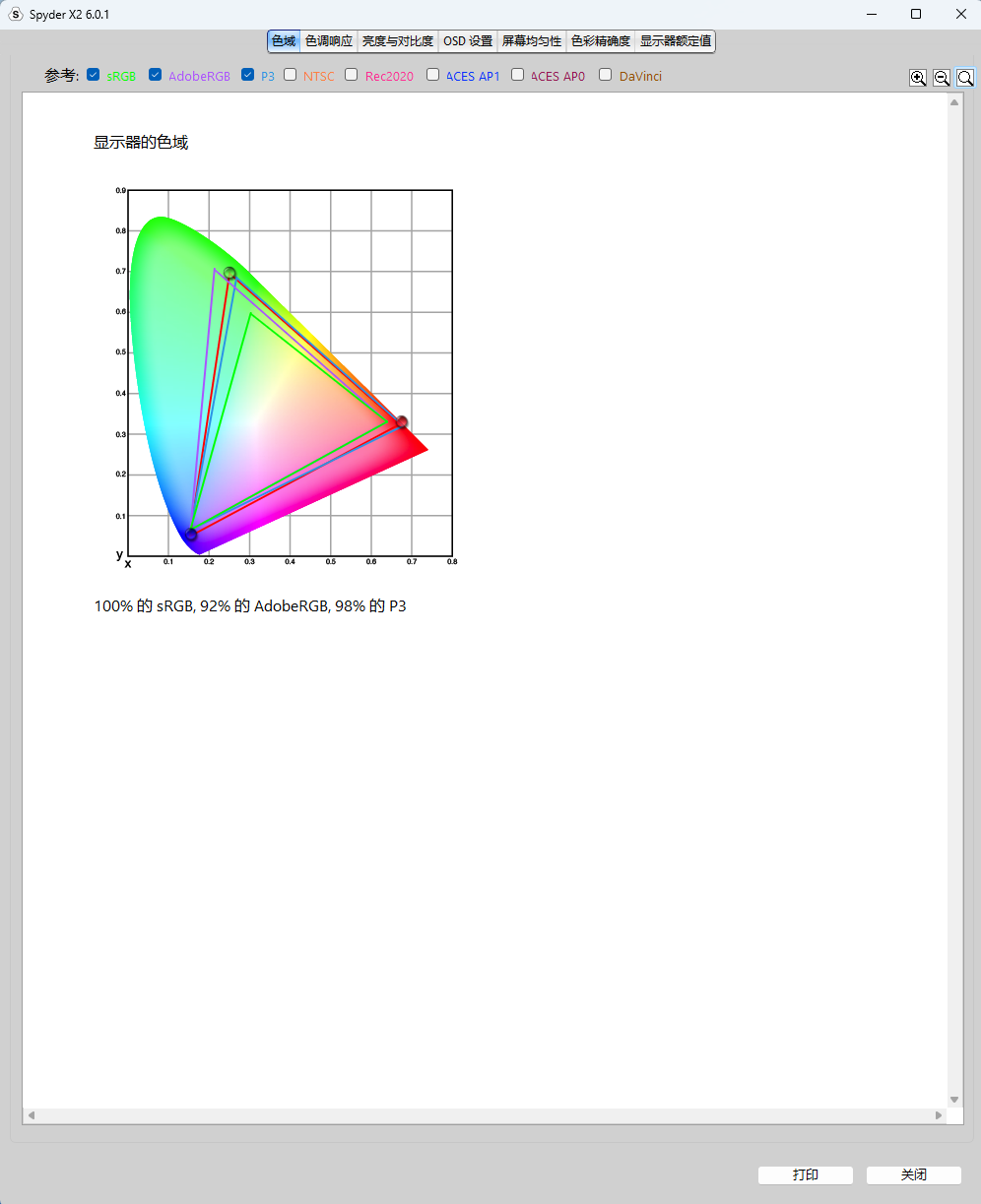 在默认模式下,通过较色仪可以看到显示器的色域表现:100%sRGB/92% AdobeRGB/98% DCI-P3色域覆盖,色彩优与劣的表现这个也是体现厂商的出厂校色的能力。