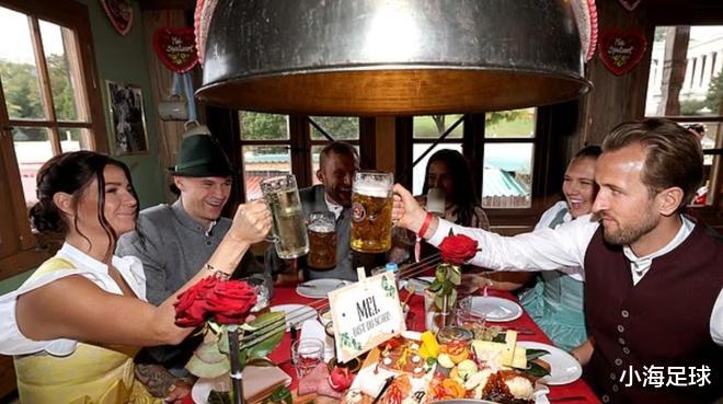 这位英格兰队长如今已经迎来在拜仁的第三个赛季,图片中他身穿巴伐利亚传统皮短裤(Lederhosen),手举大啤酒杯,尽显节日气氛。妻子凯特也一同出席,两人一同亮相,宛如节日现场的焦点。