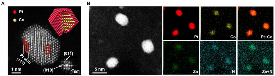 图5:(A)具有PtCo核壳结构的HAADF-STEM图像。(B)g-Zn-N-C/PtCo的HAADF-STEM图像及其对应的EDS元素分布图。