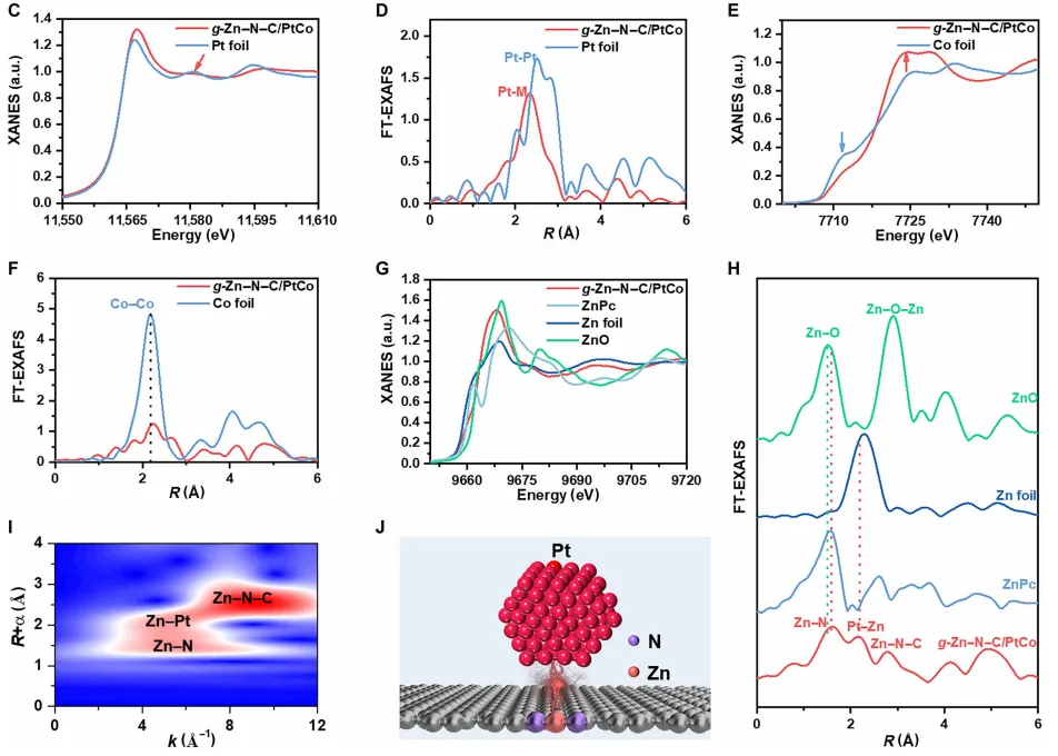 研究员制备了g-Zn-N-C/PtCo催化剂(即锌-氮-碳载体负载的铂钴纳米颗粒),并通过Zn的K边EXAFS分析探究Zn的局部环境。在R空间图谱中(图H、I),2.18Å处的峰被归为Pt-Zn配位,2.80Å处的峰则对应Zn-N-C配位。