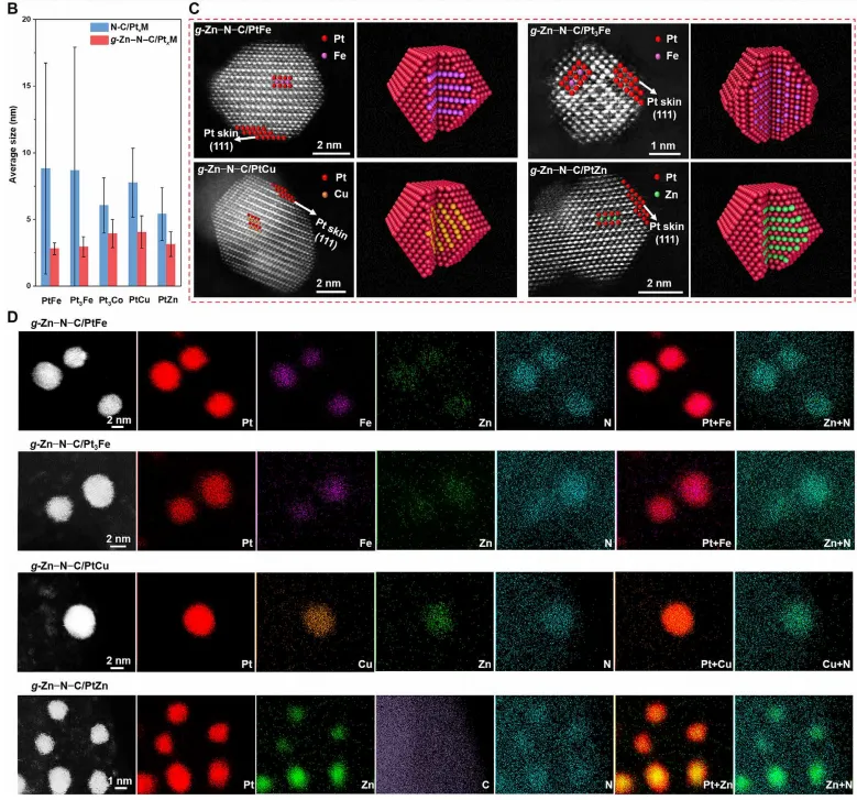 HAADF-STEM:直接观察到g-Zn-N-C/PtCo的纳米颗粒尺寸均匀(平均3.3±1.0 nm),且酸处理后仍保持分散;而没有“原子胶”的N-C/PtCo则出现明显烧结。这说明“原子胶”能抑制团聚,但无法直接证明原子间的相互作用。