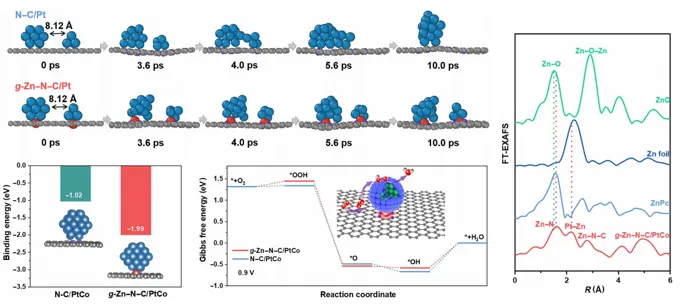 计算显示,PtCo团簇与Zn-N-C载体的结合能(-1.99 eV)远高于与N-C载体的结合能(-1.02 eV),这与同步辐射R空间观察到的强配位相互作用一致,从能量角度解释了“原子胶”的稳定性来源。