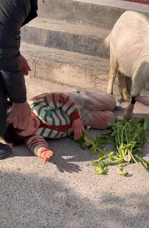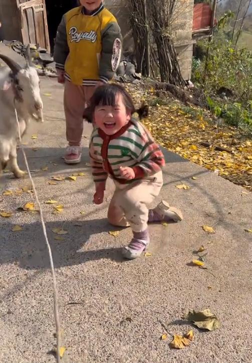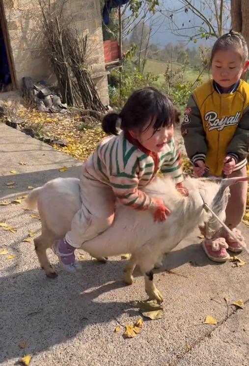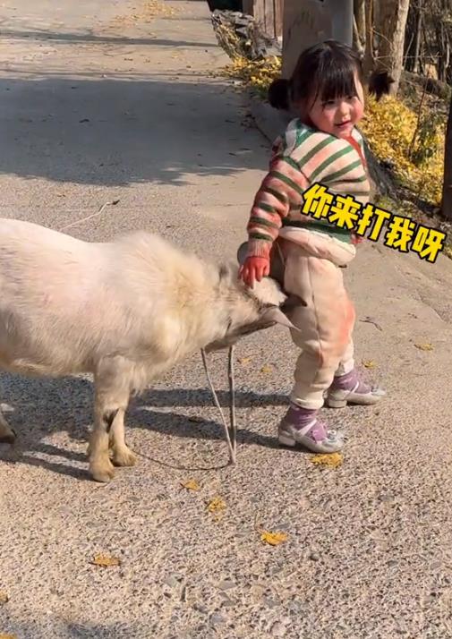 瑶一瑶性格也很皮,竟然敢骑羊,摔倒了好几次也不哭反而哈哈笑,看羊没发脾气她继续用屁股挑衅,两个家伙干起来了,用羊角顶她也不怕。
