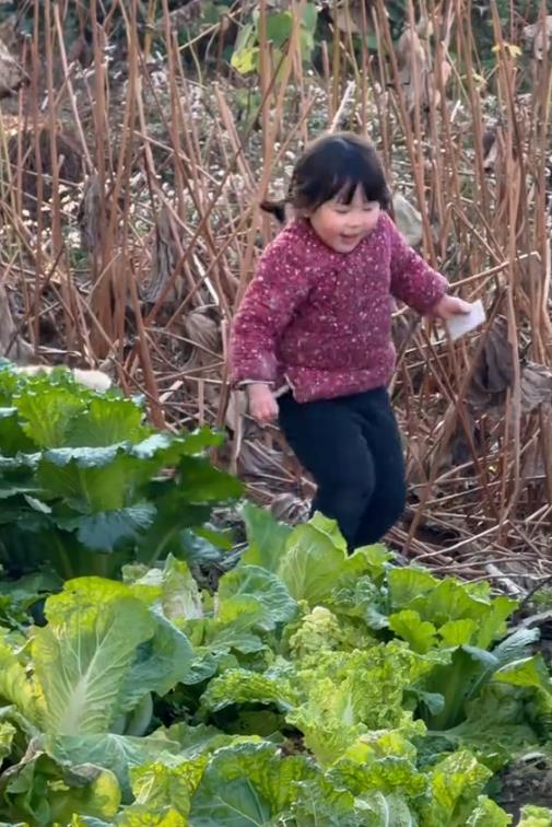 前一秒还站的好好的,下一秒就滚到白菜地里了,她爸妈看到后哈哈大笑,最后还是自己爬上来的,也没哭。