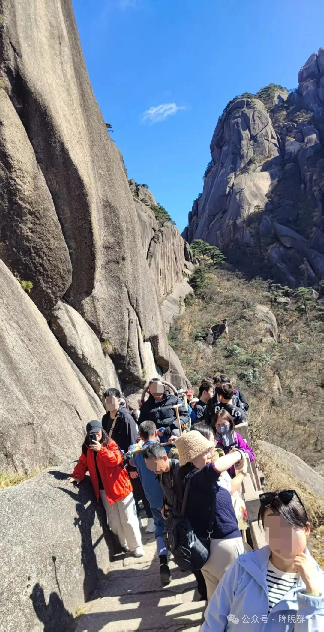 凌晨5点,天色还全黑,便奔赴检票口。原以为可避开人潮,却见检票口早已人山人海,用我那钛合金双眼预估了下,嗯,大概一亿人。不禁暗自忖度,黄山果然没淡季。在我以常人非正常神力加持之下,我幸运成为第二名线下预约到天都峰的人。预约好后,询问售票员小姐姐才得知天都峰线下就170张票,且是本年度最后一天开放(同西海大峡谷于2025年12月1日起一起进入冬季维护期,暂停开放)。闻言,我不禁庆幸又激动,以至于我在去往景交车路上,得意洋洋的告诉后边那1亿-170还在苦苦排队的人,说没必要再排队了。那一刻,我甚是得意(此处用“哈哈”两字来表达我至今还尚存的激动)。