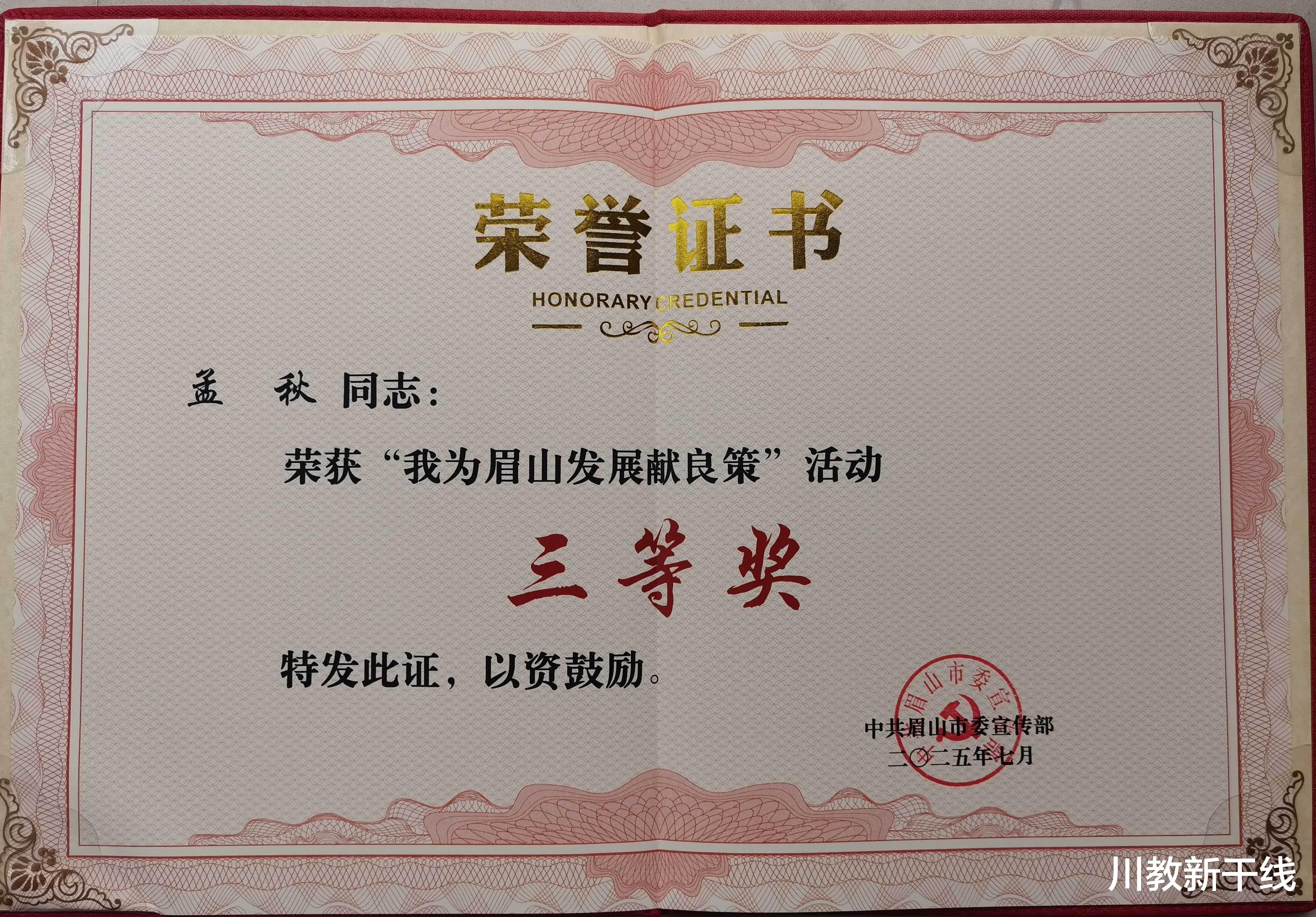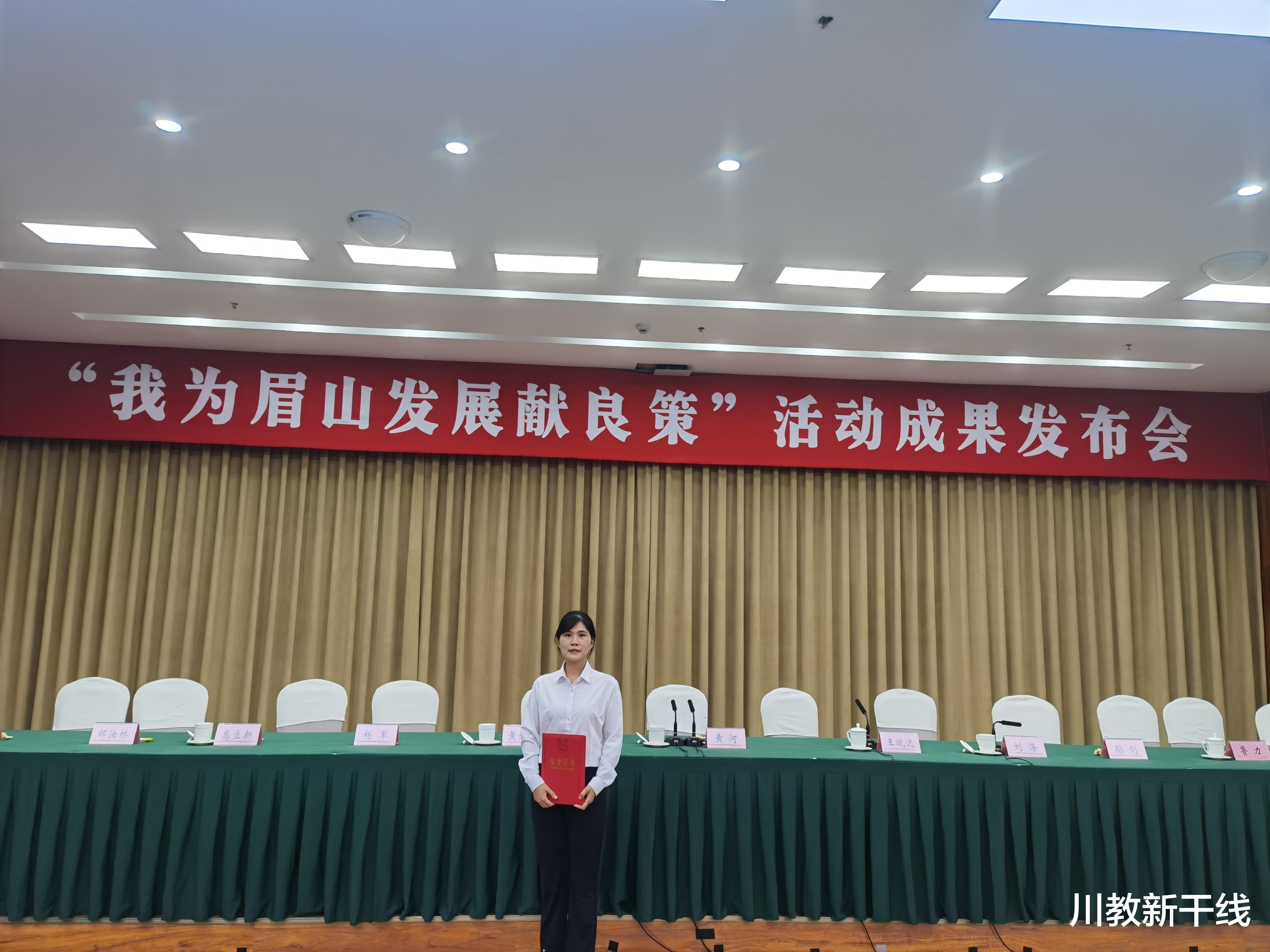 近日,眉山市“我为眉山发展献良策”活动圆满落幕,四川工商学院人文教育与应用学院教师孟秋凭借《关于眉山打造西部中试转化基地的建议》,从全国25个省(市)、自治区及香港特别行政区市民提交的5660条建议中脱颖而出,斩获三等奖。她是在眉高校中唯一建议被采纳者,并作为高校教师代表在9月30日于眉山市会议中心举行的活动成果发布会上发言。此次发布会眉山市委常委班子全员出席,现场为获奖代表颁发荣誉证书。