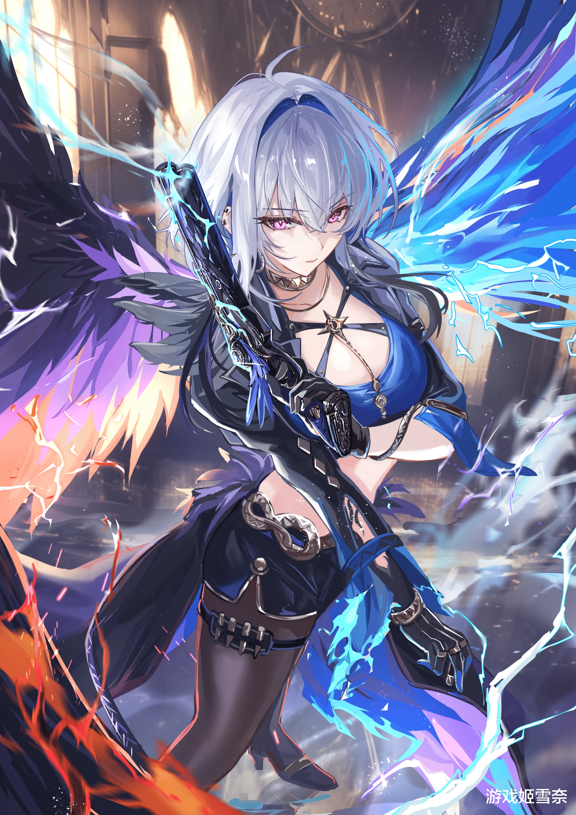 嘉贝莉娜虽然是玩枪的,但并非是因为嘉贝莉娜惯用枪,只是因为枪用来方便,一是被误解只会用枪让敌人注意力放在枪上,进而容易忽视嘉贝全身上下的都能作为武器的凶险,无论是格斗技艺,还是恶魔化的羽毛与血液都能化为致敌于死地的大杀器,嘉贝莉娜就像是修仙小说里身板脆弱的召唤师,敌人跟嘉贝械斗后觉得棘手,误以为击败她必须要斩首快速近身,结果打到嘉贝脸上发现用枪只是顺手,其实近身战斗更强让敌人绝望,不绝望也会惊讶的漏出破绽,被嘉贝斩杀。