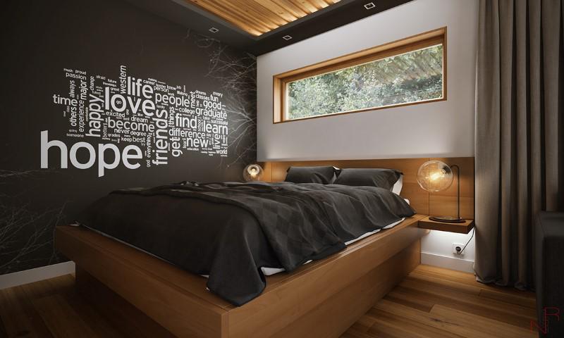 在很多地方我们可以见到黑板墙,并且在个性的的单身公寓中也是很常见的,而这里在这样的单身别墅中一样显得大气而又别具一格。床头使用长方形的玻璃窗作为采光,与两边圆形的灯具搭配,相得益彰。