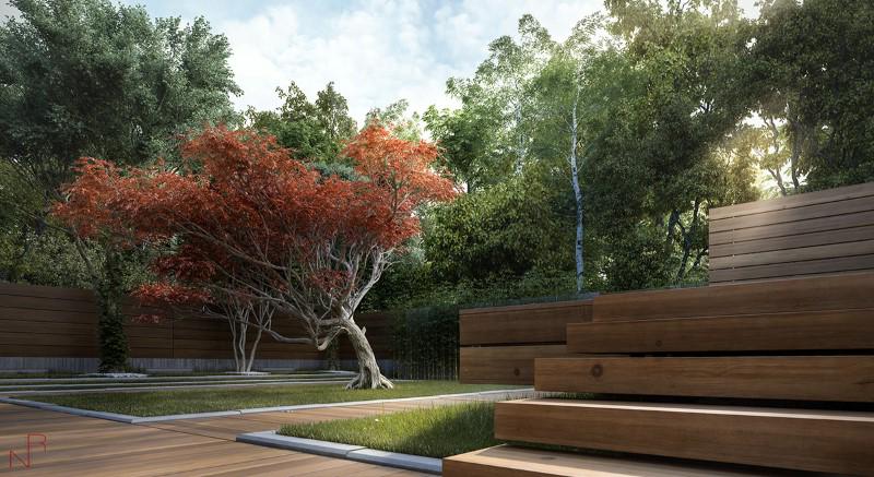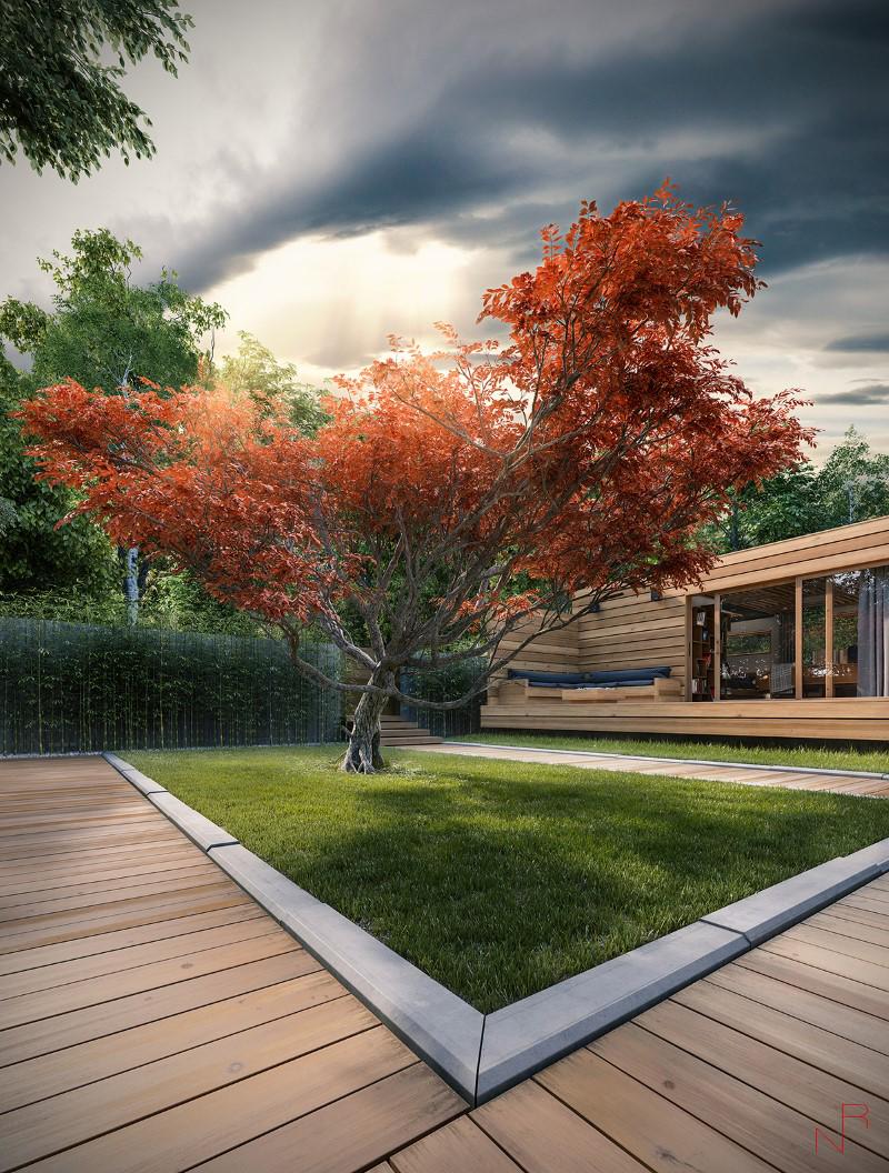 花园中设计比较简单,却非常的接近自然,两棵枫树非常应景,非常具有避暑山庄的感觉。四周是由树木包围,整个花园就像在森林的别院。