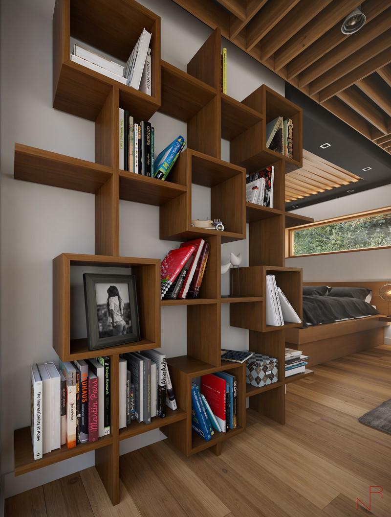 造型的木质书架,与顶面木质保持了一致的颜色,并且与地面一致,协调统一的书架就形成了。