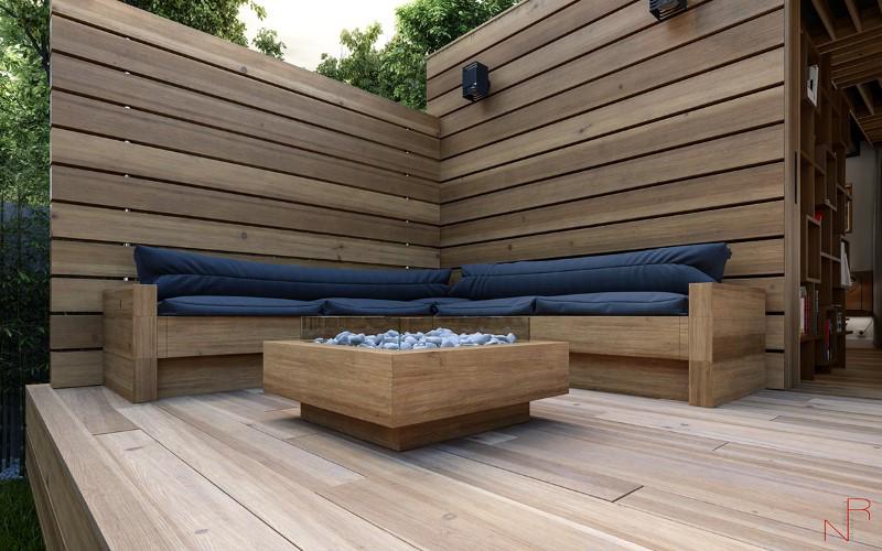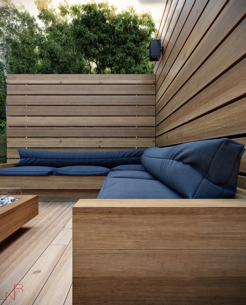 户外的休闲沙发也是原木色的厚重感觉,纹理清晰,与墙面的颜色几乎保持一致,加上蓝色的布艺沙发垫也是非常漂亮大方。