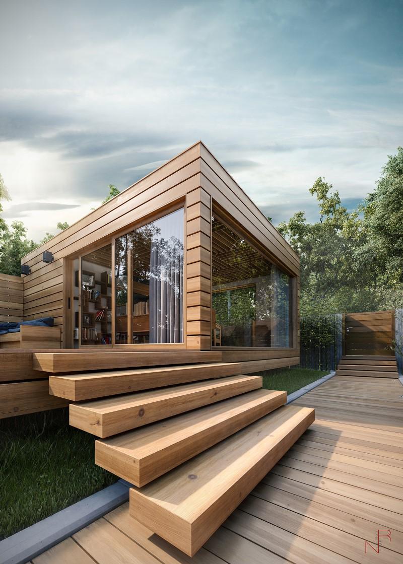 外观上使用木质,并且有楼梯,有阳台,大面积的玻璃窗。该建筑距离地面一米高,使用楼梯上平台(阳台),阳台上摆放了休闲的室外沙发,并且在角落形成一道风景线。