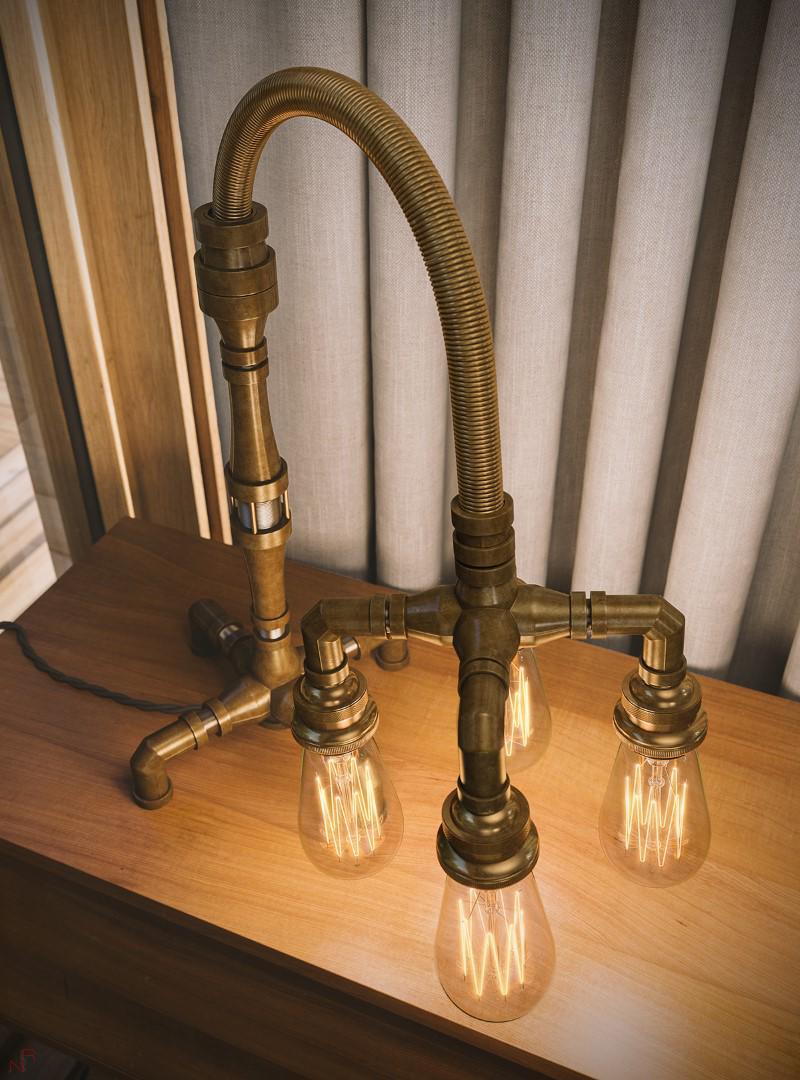 使用水管做的古铜色灯具,在这里也用上了工业设计,这里的灯泡是在很多地方可以见到的。