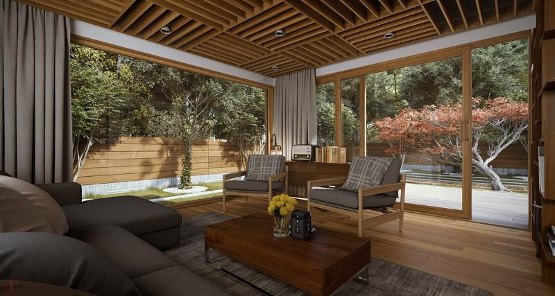 两面玻璃窗更是让空间非常通透,摆上原木的布艺沙发,配上两个独立凳子也是很完美的搭配,接待客人也是再适合不过了。顶用的是原木的造型吊顶,以方格拼接成造型,显得自然大方。