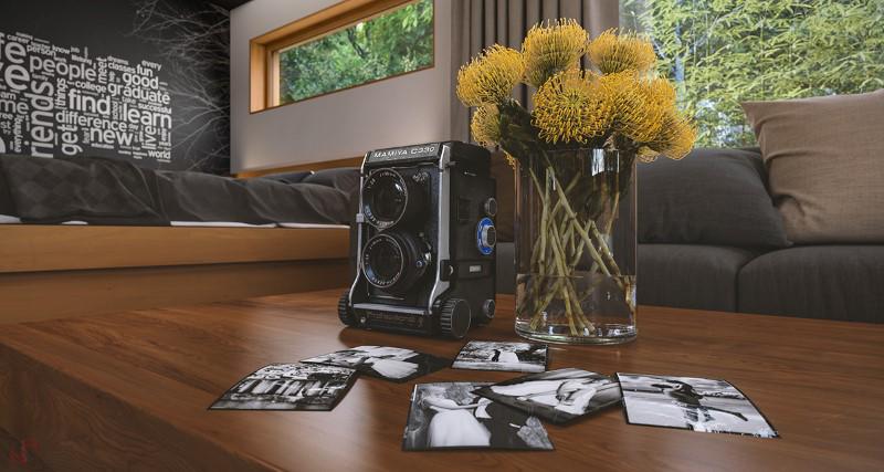 茶几上摆放非常简单,只需要接近大自然就可以了,使用了相机以及一束不一样的花作为点缀装饰。