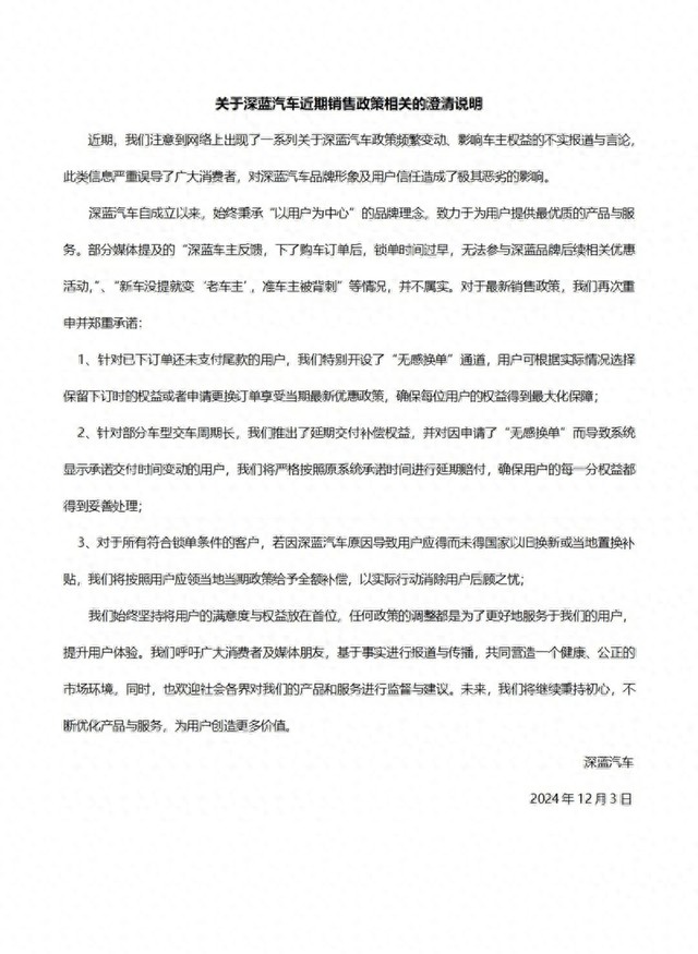 部分媒体提及的“深蓝车主反馈,下了购车订单后,锁单时间过早,无法参与深蓝品牌后续相关优惠活动,”、“新车没提就变“老车主’,准车主被背刺”等情况,并不属实。