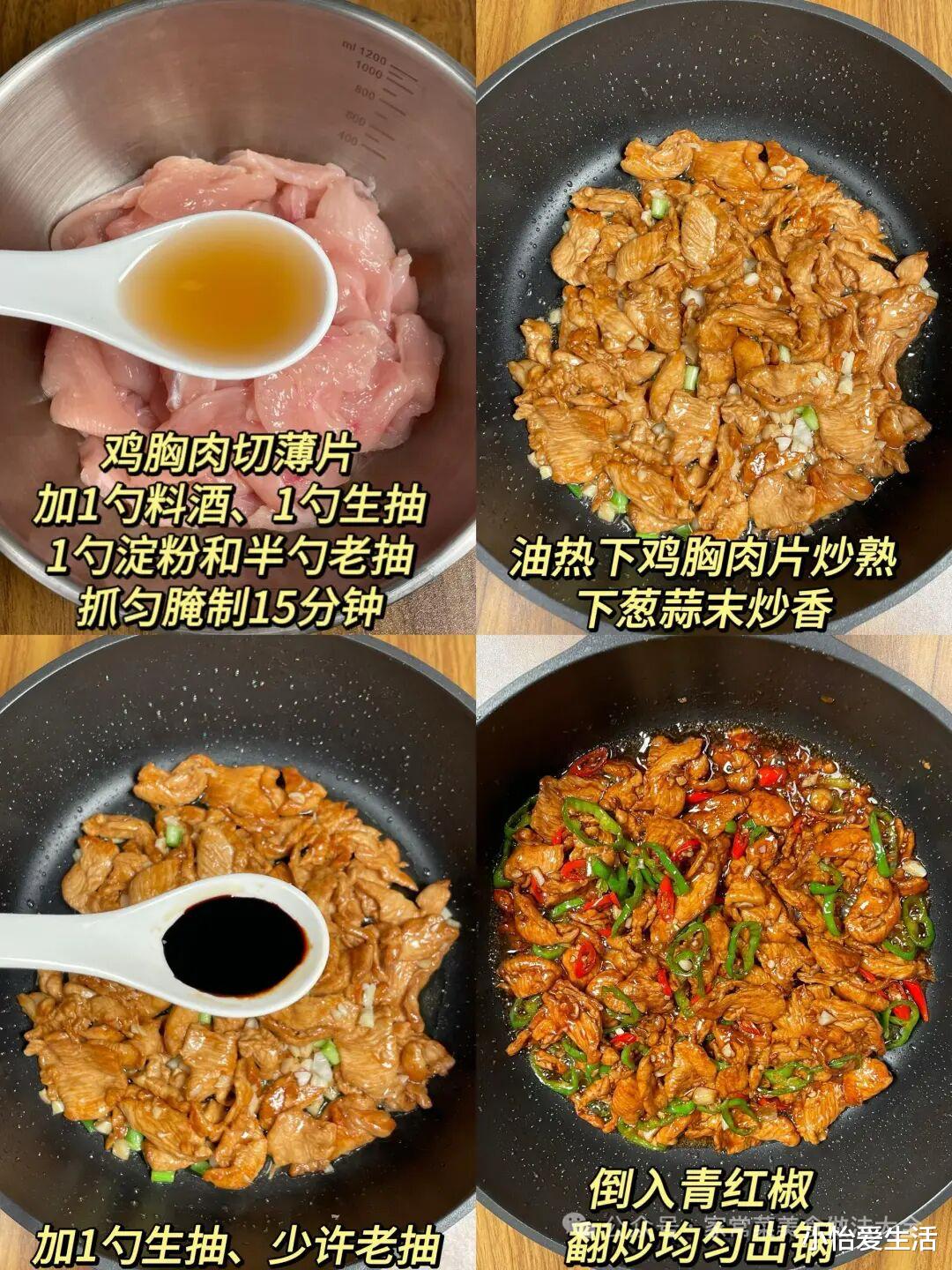 1. 鸡胸肉逆纹切成薄片,加料酒、生抽、淀粉抓匀,腌10分钟。