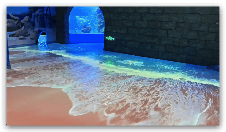 步入展馆首个互动区,8台奥图码 GEU9162ST激光投影机在近40平方米的地面上投射出逼真的海浪沙滩画面。
