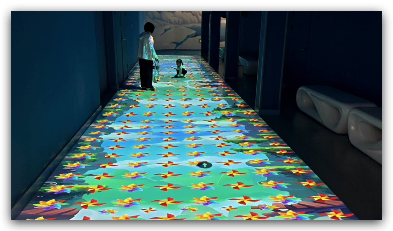 孩子们在地面上追逐、跳跃,脚下的动画随之变化,这片区域成为整个海底世界中笑声最密集、孩子聚集最多的场所。