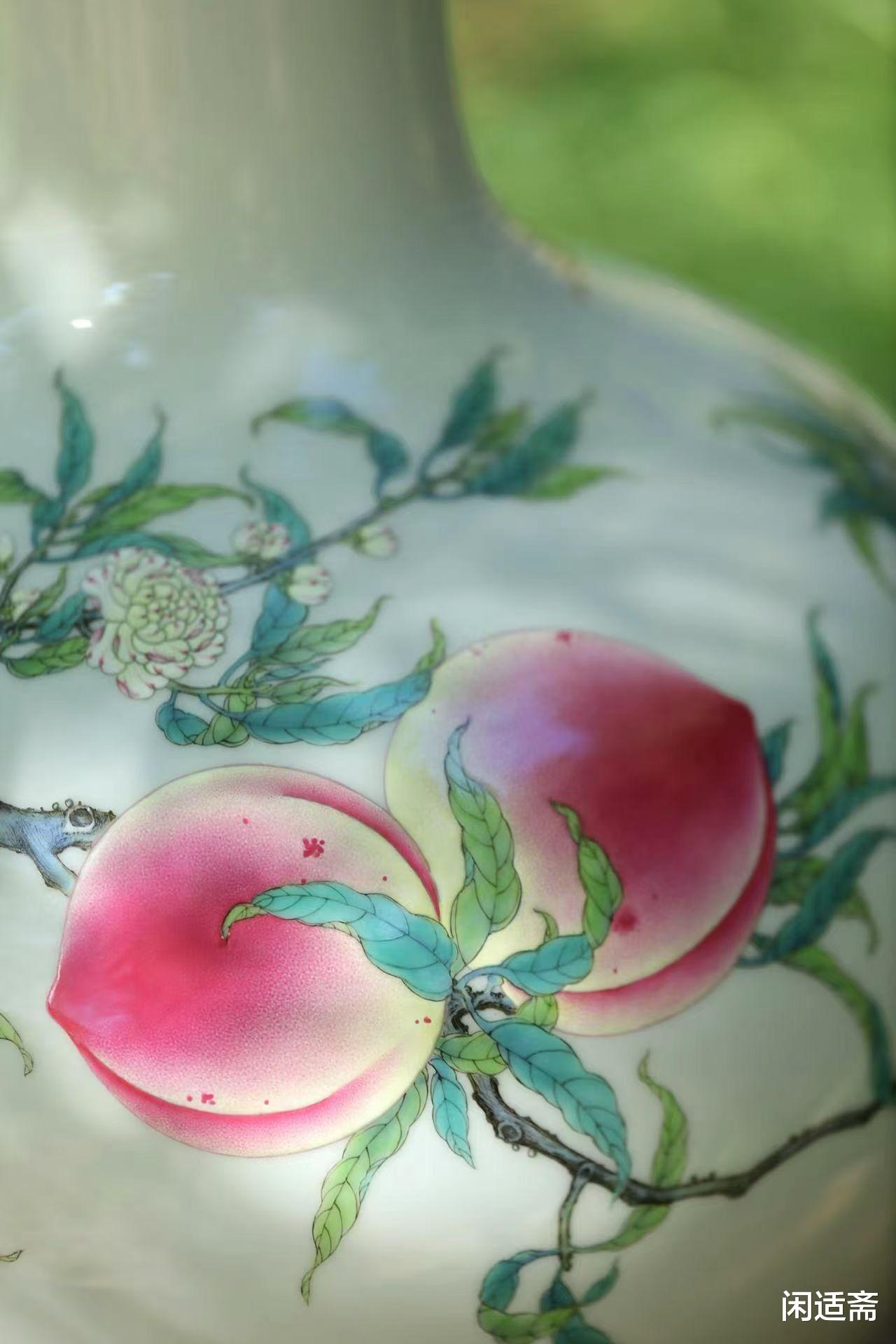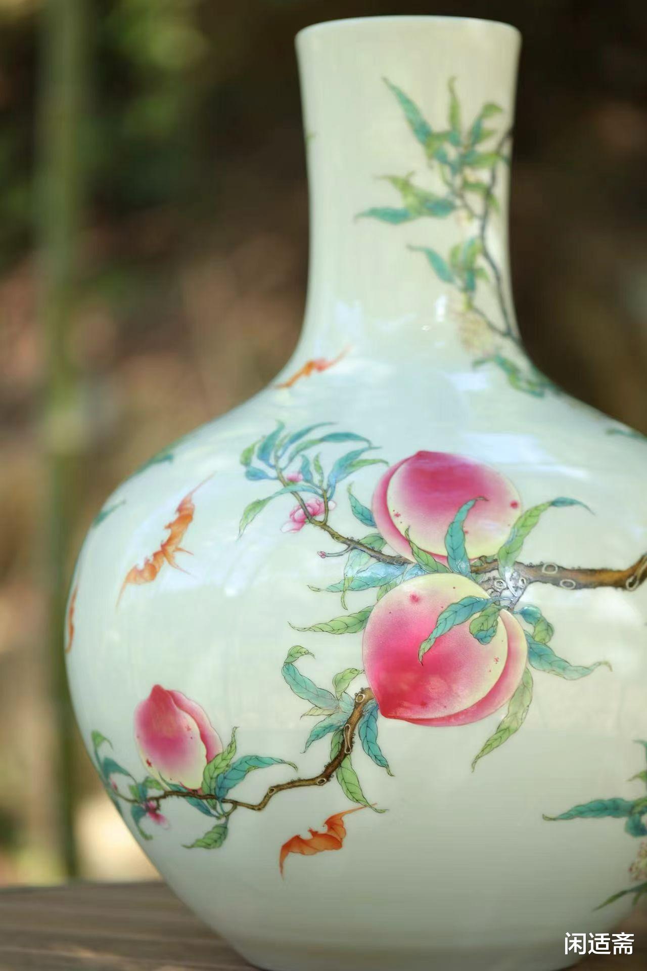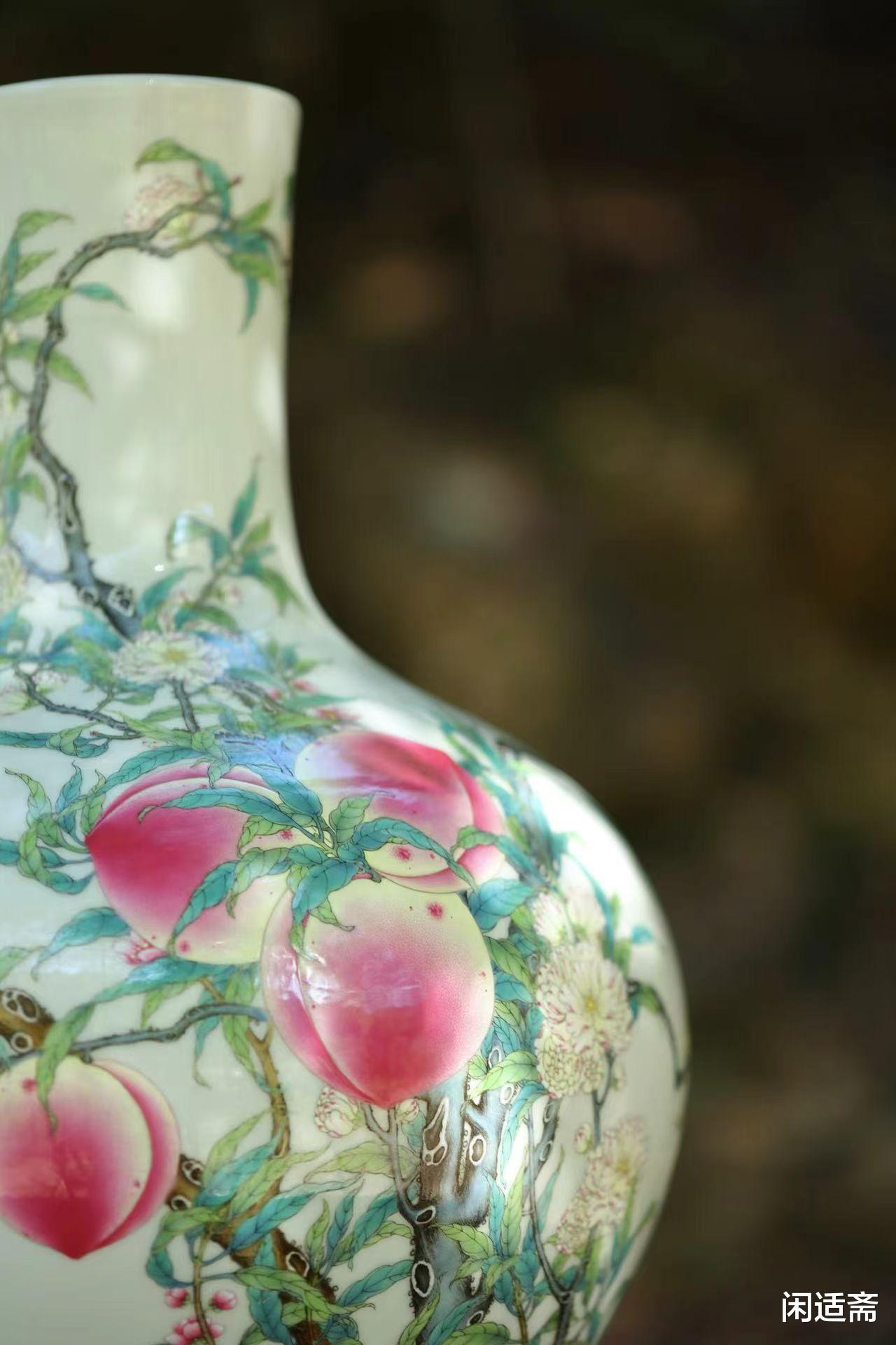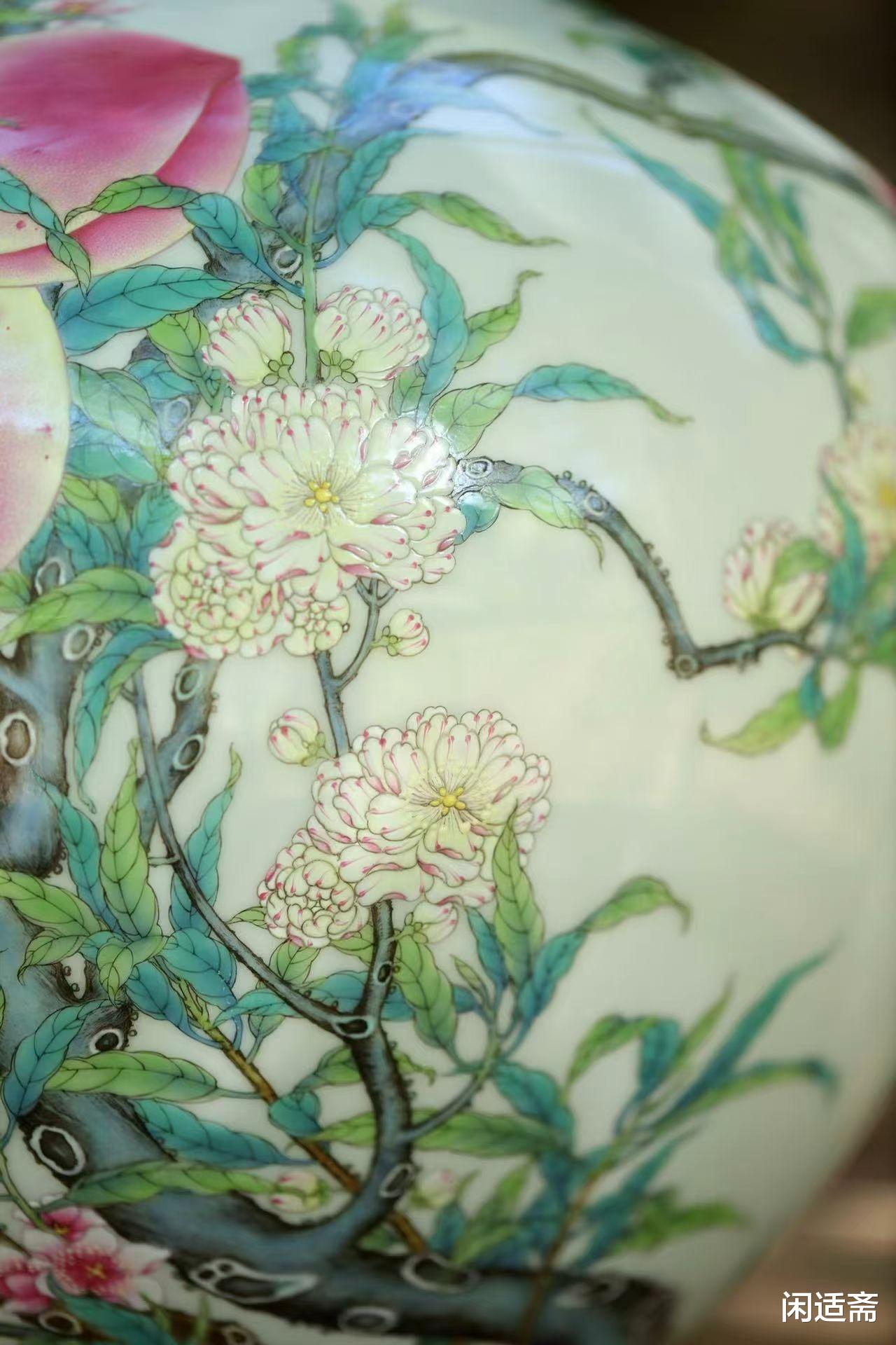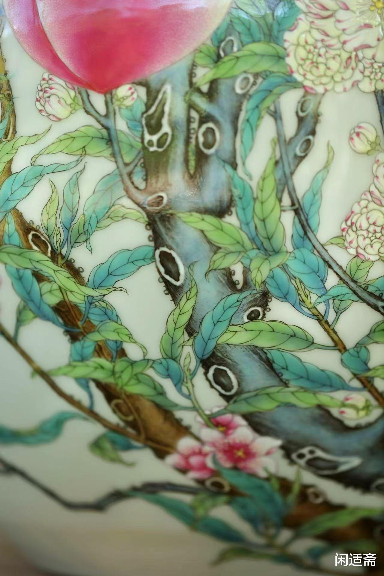 腹部纹饰是整器的灵魂,将自然意趣与吉祥寓意完美交织。匠人以粉彩为笔,在洁白瓷胎上勾勒出一株茁壮桃树:树干苍劲有力,带着天然的斑驳纹理,从腹部底部蜿蜒向上,枝桠肆意舒展,尽显生命力;九颗硕桃饱满圆润,沉甸甸压坠枝头,粉白渐变的果皮上泛着晶莹光泽,仿佛能嗅到成熟的甜香;更妙的是枝叶间翻飞的红蝠,翅翼舒展灵动,与桃实相映成趣。这组 “桃蝠纹” 暗藏深意:“桃” 象征多子多孙、长寿安康,“蝠” 与 “福” 谐音寓意福气临门,九颗桃实呼应 “九重春色” 的诗意,合为 “多子多孙,多福多寿” 的美好祈愿,将自然景致与人文祝福融于一画。
