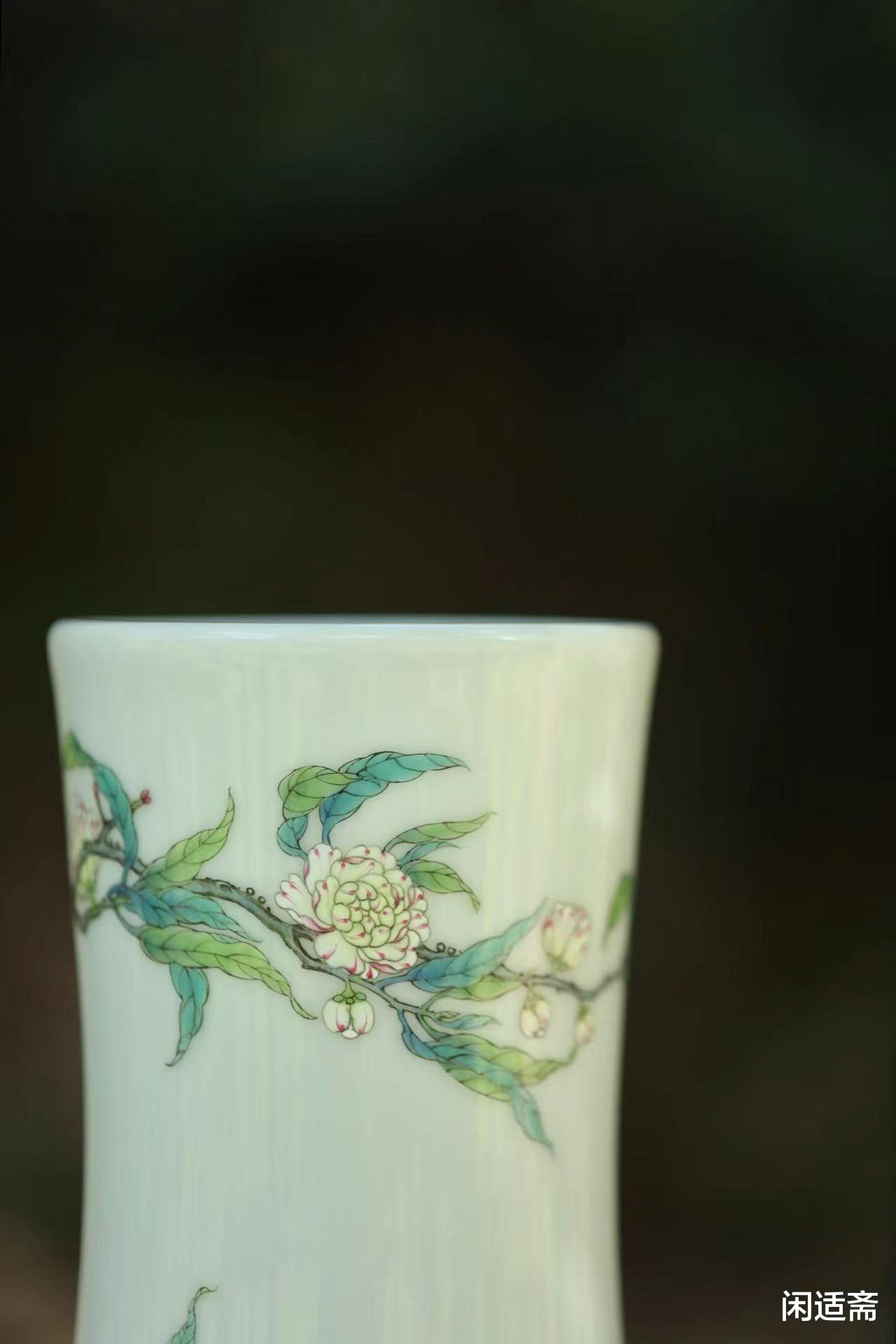 器型设计暗藏章法,尽显雍正瓷的 “秀雅之姿”。赏瓶采用经典 “直口长颈,圆腹,圈足” 形制,颈部修长挺拔如玉柱,腹部圆润饱满似满月,圈足内敛稳重若磐石,自上而下的线条过渡自然流畅,无一处生硬转折。这种比例均衡的造型,既延续了古代赏瓶 “观器识人” 的礼仪属性,又契合雍正朝 “崇雅黜俗” 的审美取向 —— 不追求夸张体量,却在细节处彰显精致。