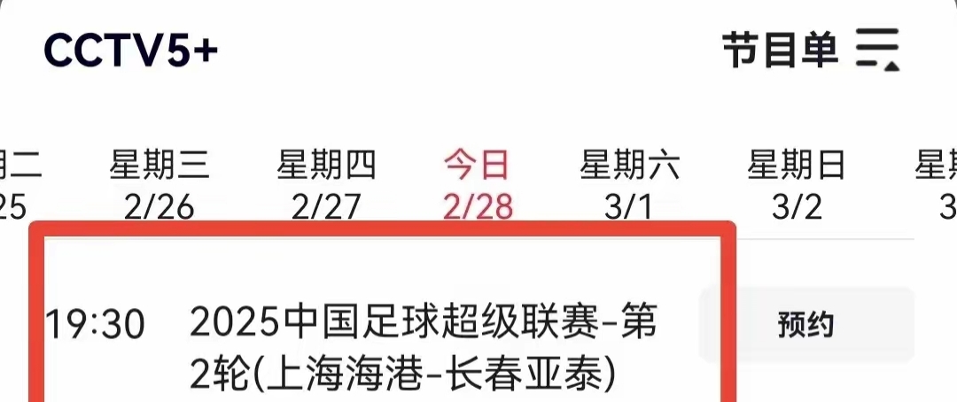 根据赛事预告,央视5+在今晚19:30将直播2025年中超联赛上海海港和长春亚泰的比赛情况!
