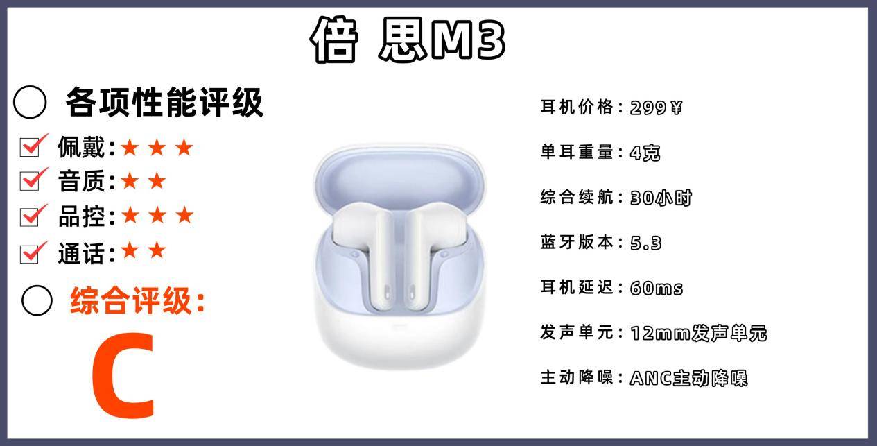倍思 M3 采用蓝牙 5.3 技术,在连接稳定性和抗干扰性方面表现不错,它采用了六麦通话降噪技术,单次使用时长可达 6 - 7 小时,搭配充电盒可实现最长 30 小时的续航能力,搭载倍思双通道低延迟技术,实际的游戏体验上没有延迟。