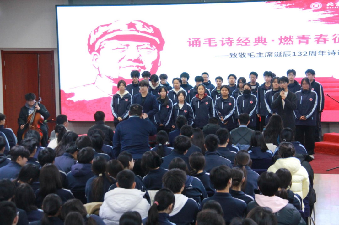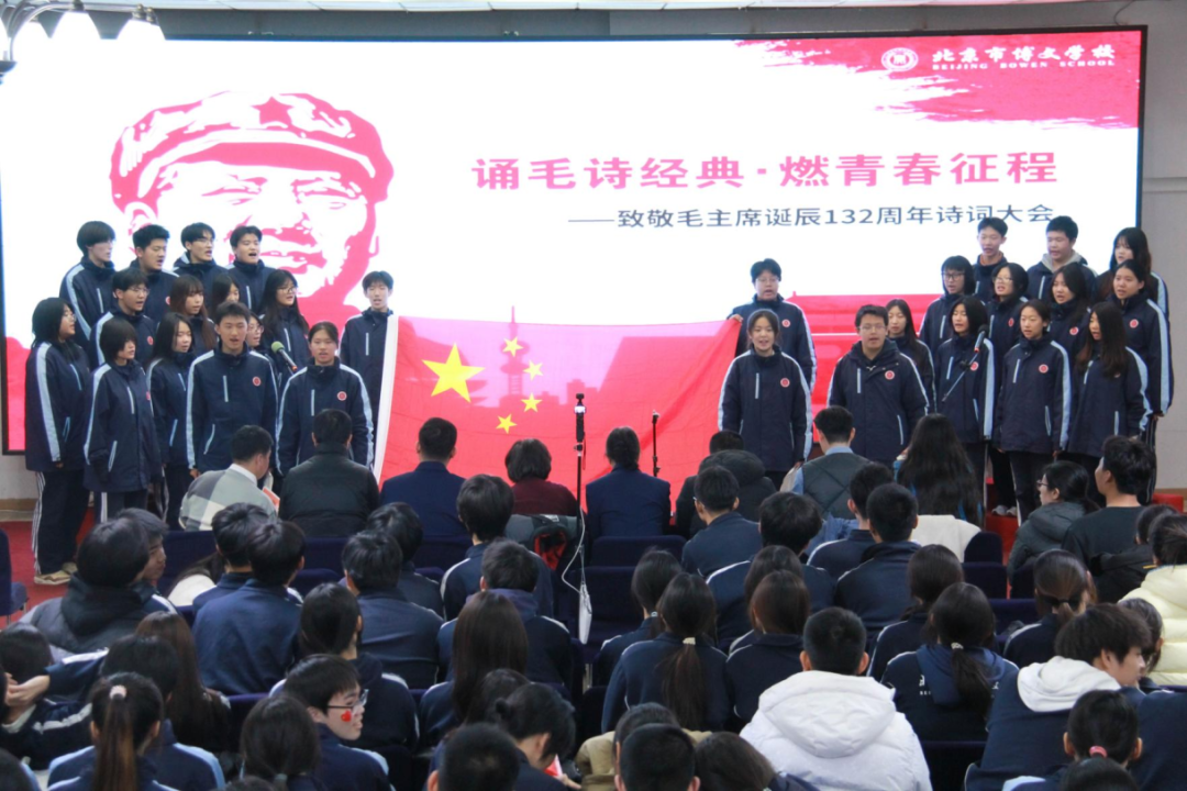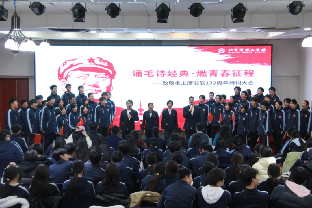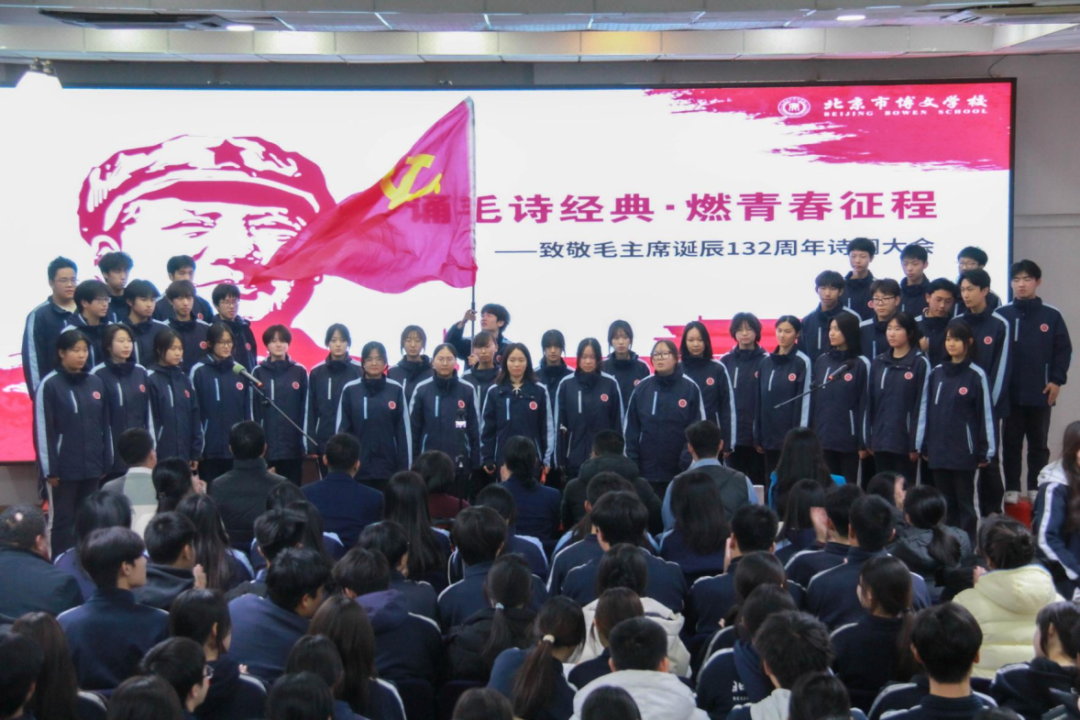 百年文脉润桃李,红色经典照初心。为致敬毛主席诞辰132周年,传承红色基因,深化爱国主义教育,同时紧扣语文教学核心目标,2025年12月24日,北京市博文学校东报告厅内诗意盎然、豪情满怀,“诵毛诗经典・燃青春征程”高二年级致敬毛主席诞辰132周年诗词大会如期举行。中央戏剧学院硕士、前天津人民艺术剧院演员主持人周老师,中国传媒大学硕士、湖南卫视多档节目策划、前《经视新闻》主持人关老师受邀担任嘉宾;我校总督学赵校长、党支部书记冯国红、德育副校长翟宇、教学主任刘小伟、德育主任马奎、高二年级主任王传蓄等领导出席活动。高二年级全体师生齐聚一堂,以声传情、以诗明志,在经典诵读中感悟伟人情怀,在青春逐梦路上凝聚奋进力量。