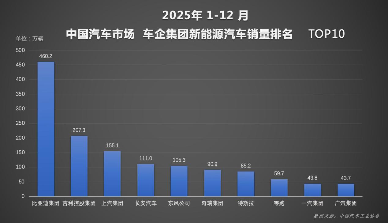 行业数据显示,比亚迪在 12 月及 2025 年全年中国汽车市场品牌销量、新能源销量、集团销量等多个核心维度均位列第一,